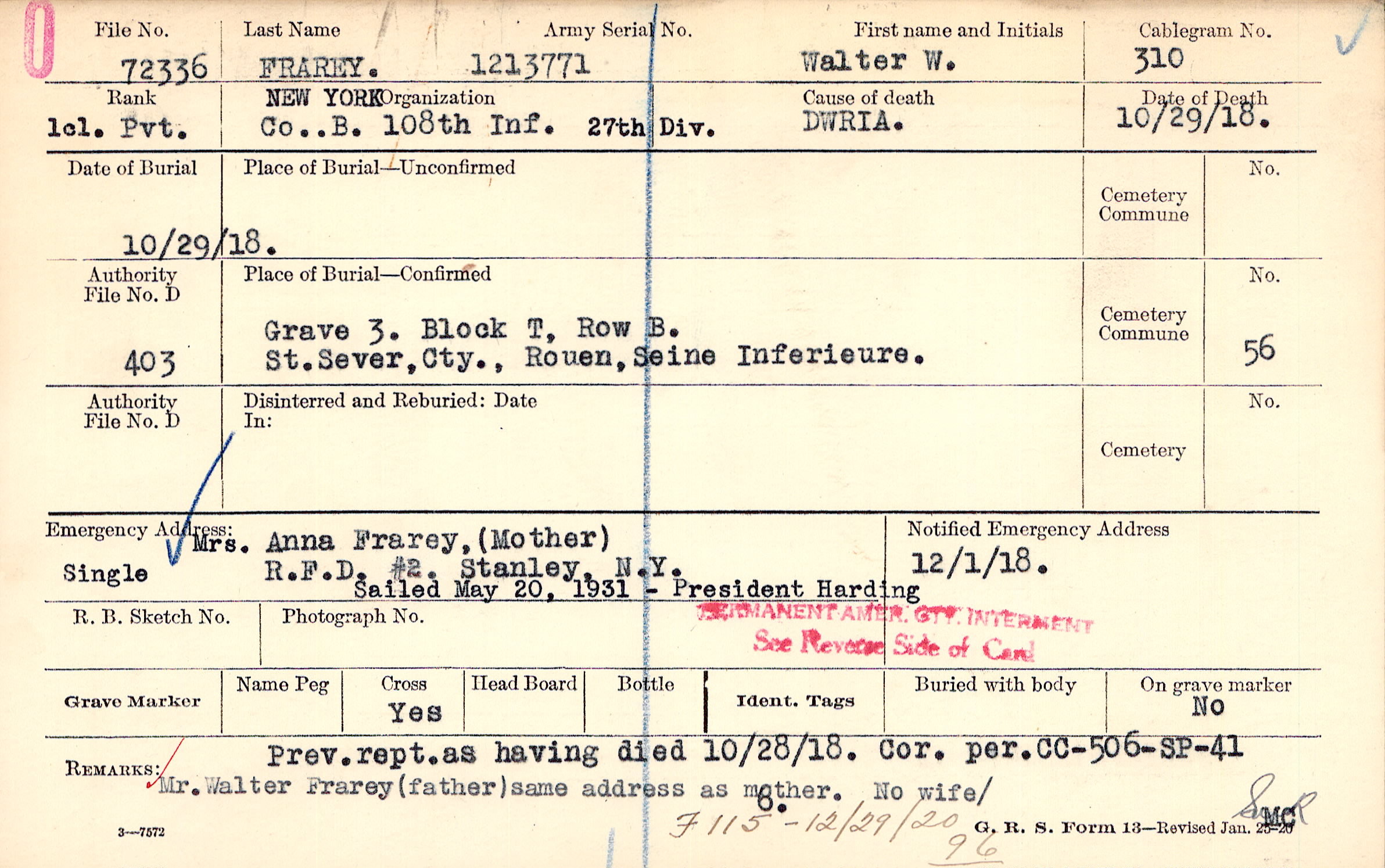 Prev. rept. as having died 10/25/18. Cor. per CC - 506-SF-41 Mr Walter Frarey (father) same address as mother. No wife, F115 - 12/29/20 96