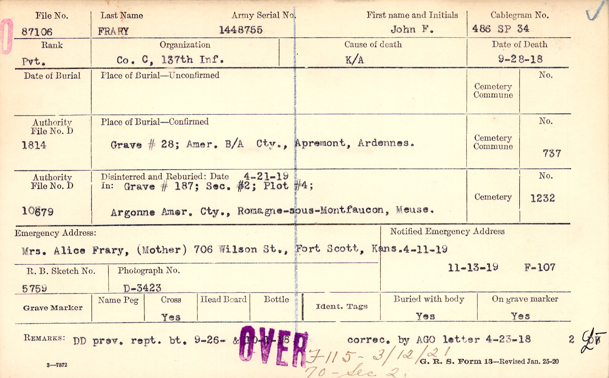 Mrs. Alice Frary, (Mother), 706 Wilson St., Fort Scott, Kans.