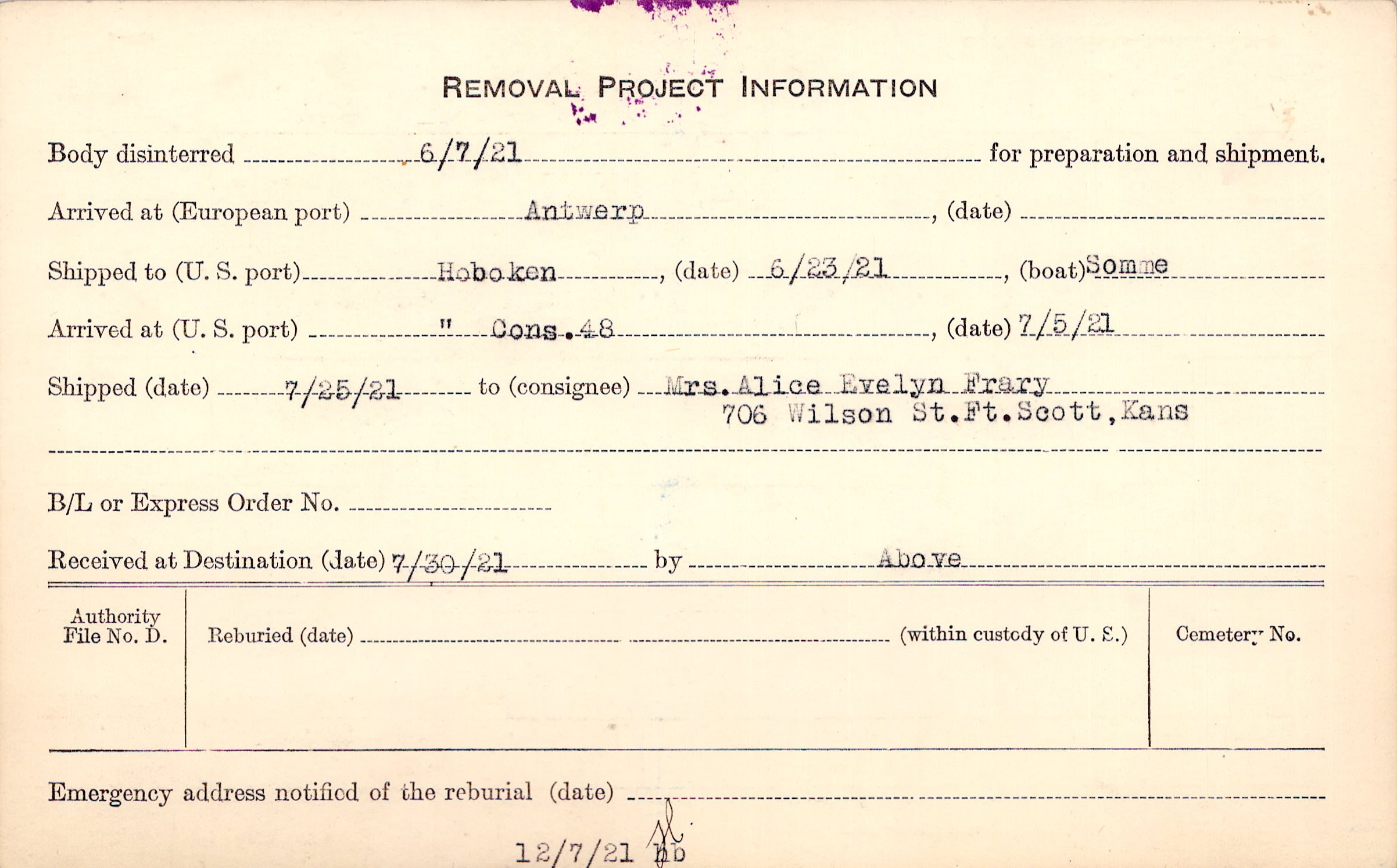 Body disinterred 6/7/1921 for preparation and shipment.