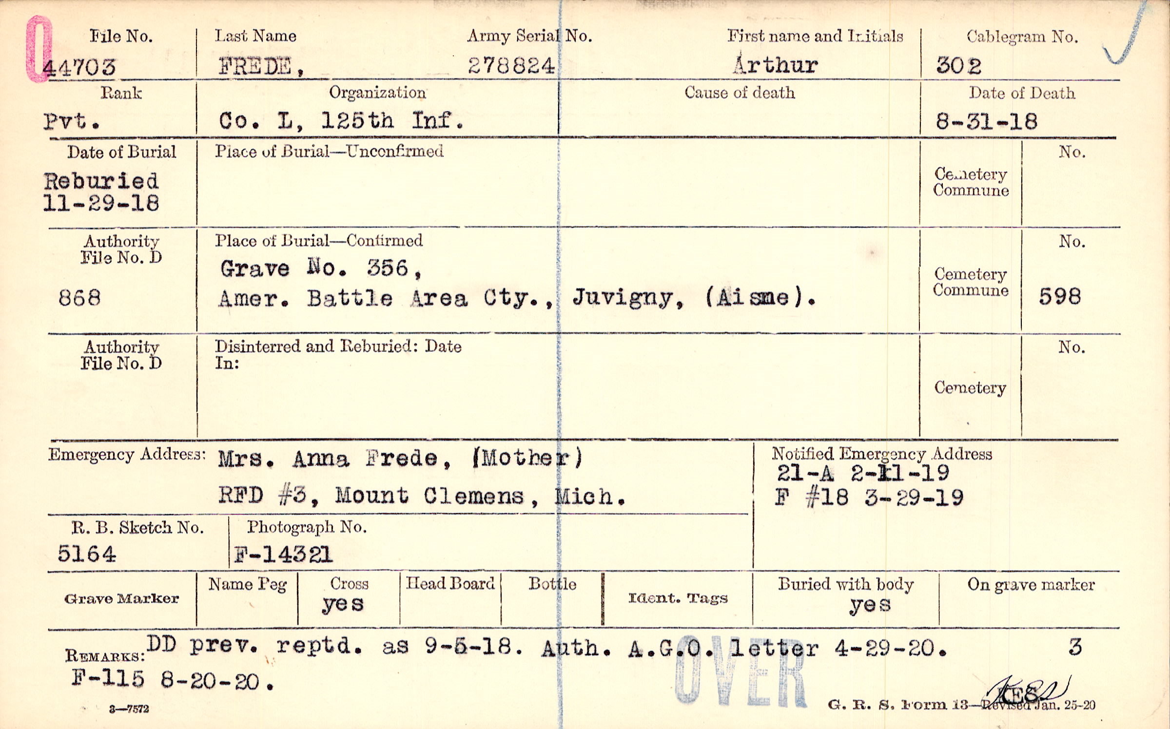 Mrs. Anna Frede, (Mother), RFD #3, Mount Clemens, Mich.