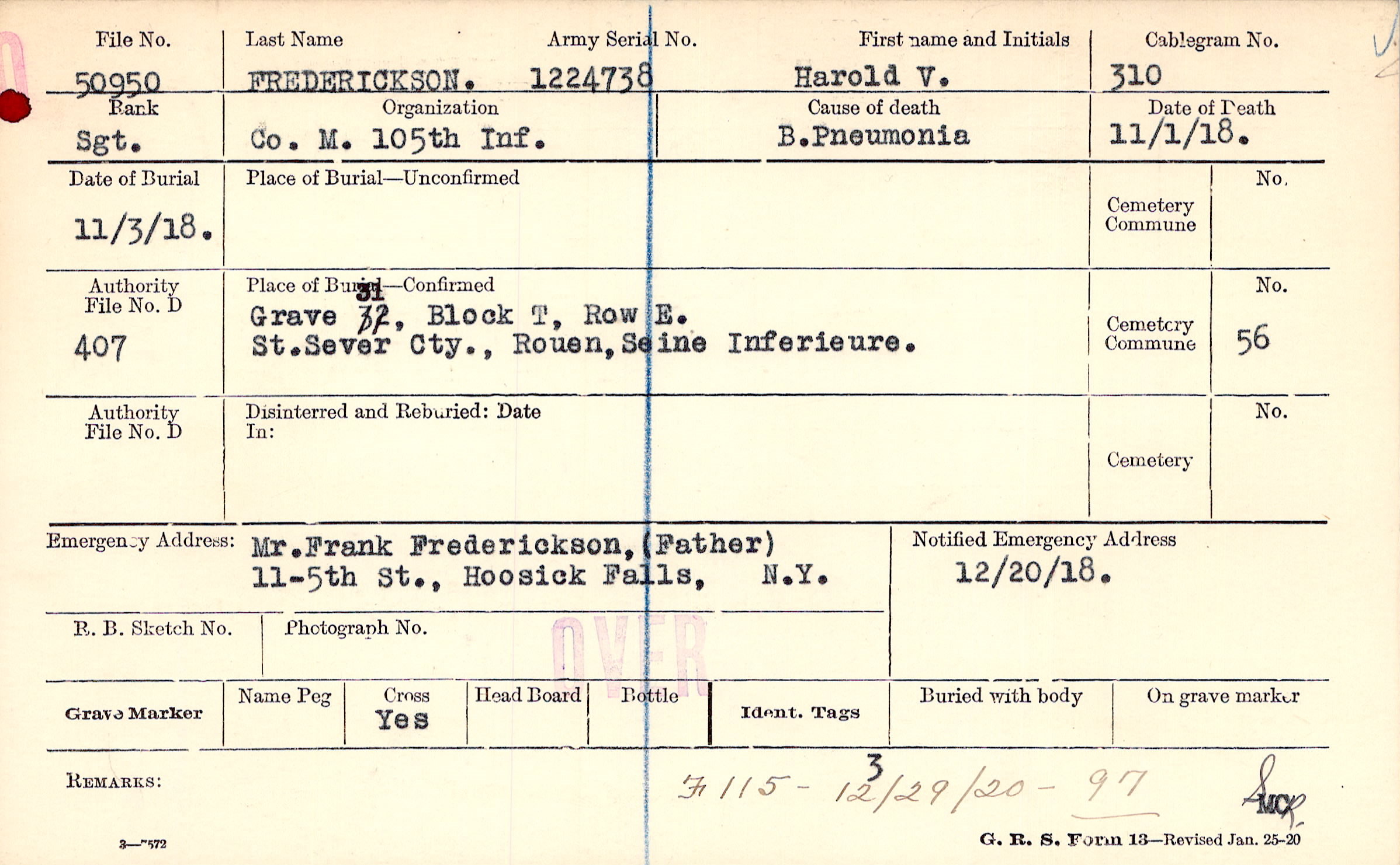 Mr. Frank Frederickson, (Father), 11-5th St., Hoosick Falls, N.Y.