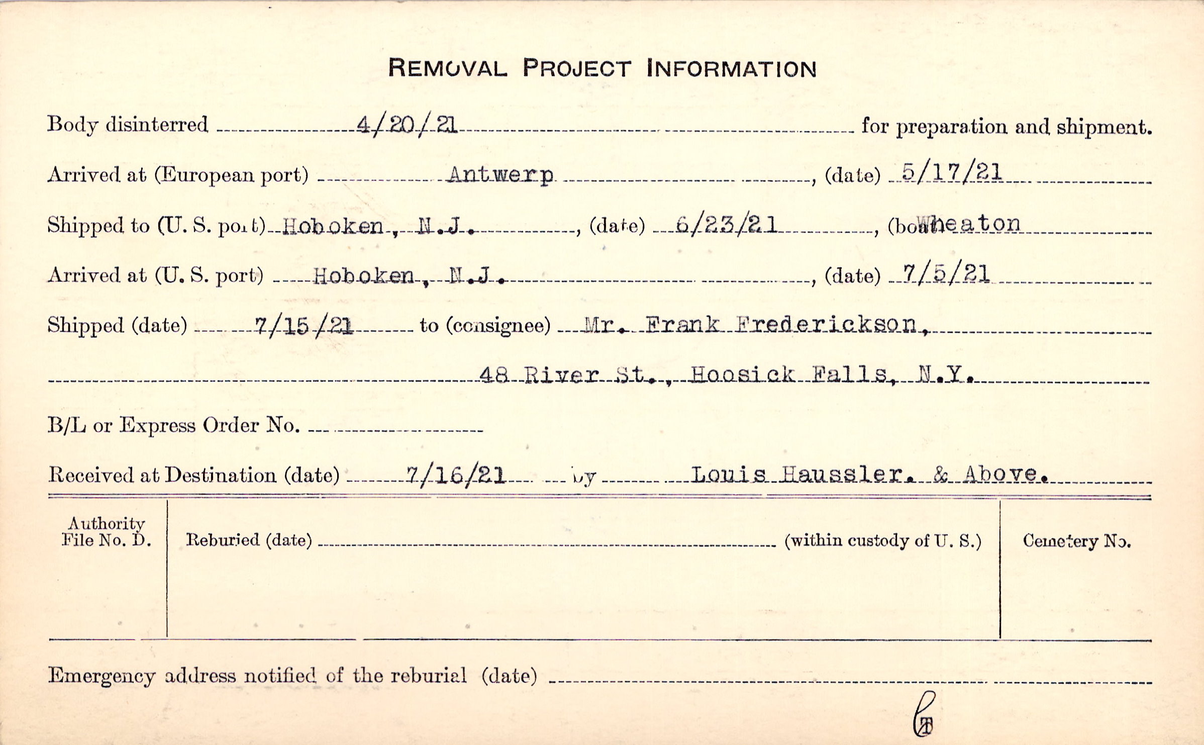 Body disinterred 4/20/1921 for preparation and shipment.