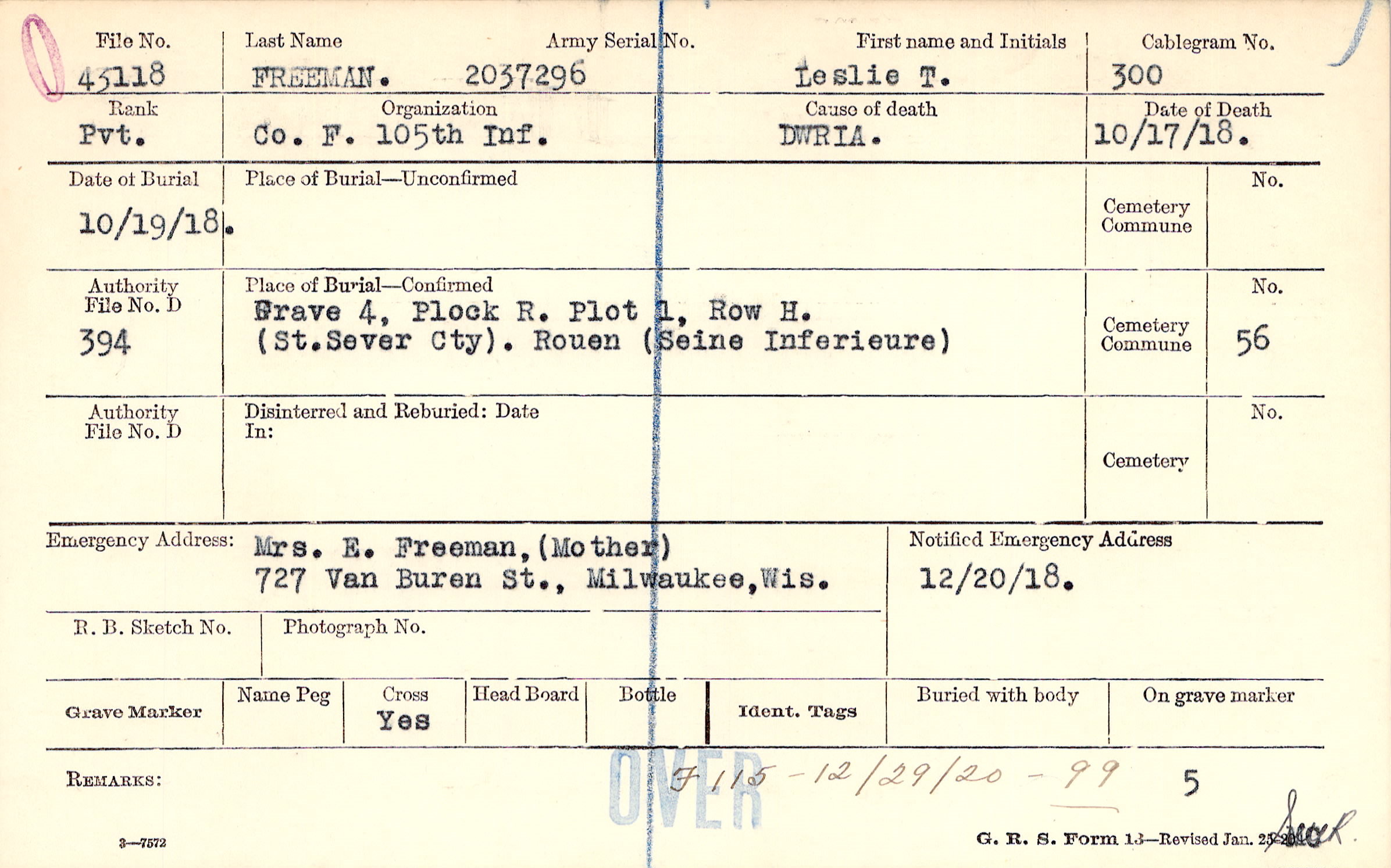 Mrs. E. Freeman, (Mother), 727 Van Buren St., Milwaukee, Wis.
