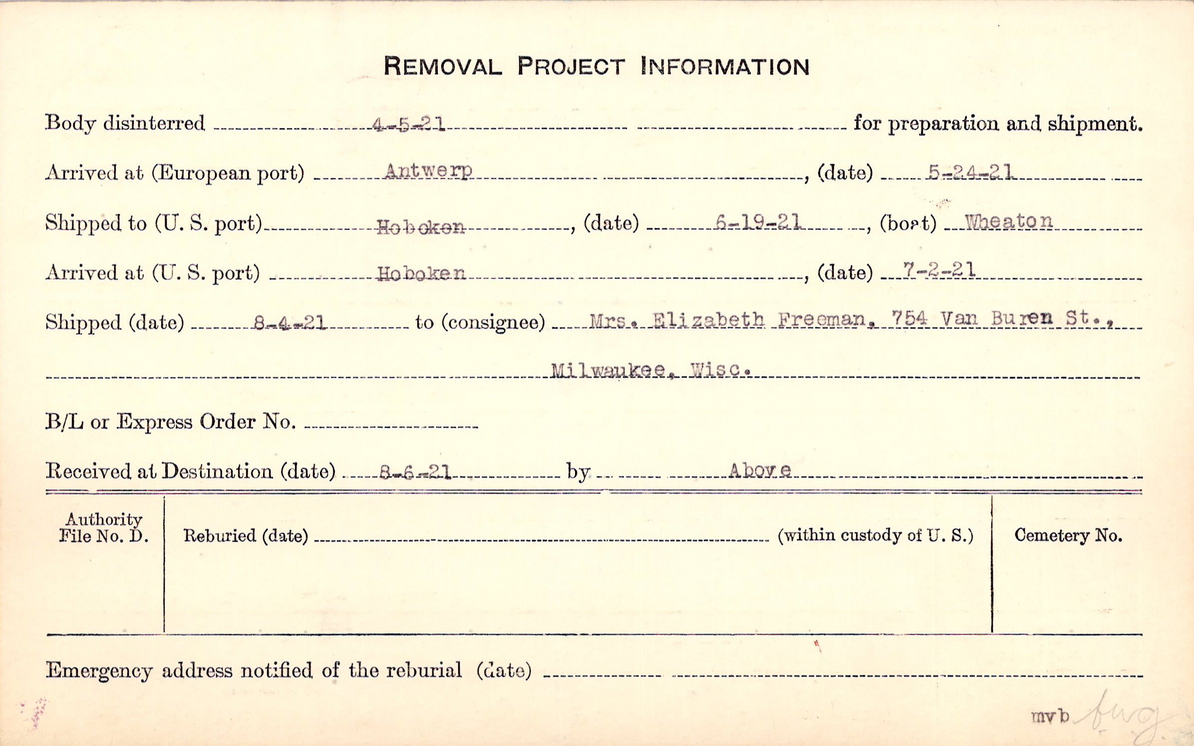 Body disinterred 4/5/1921 for preparation and shipment.