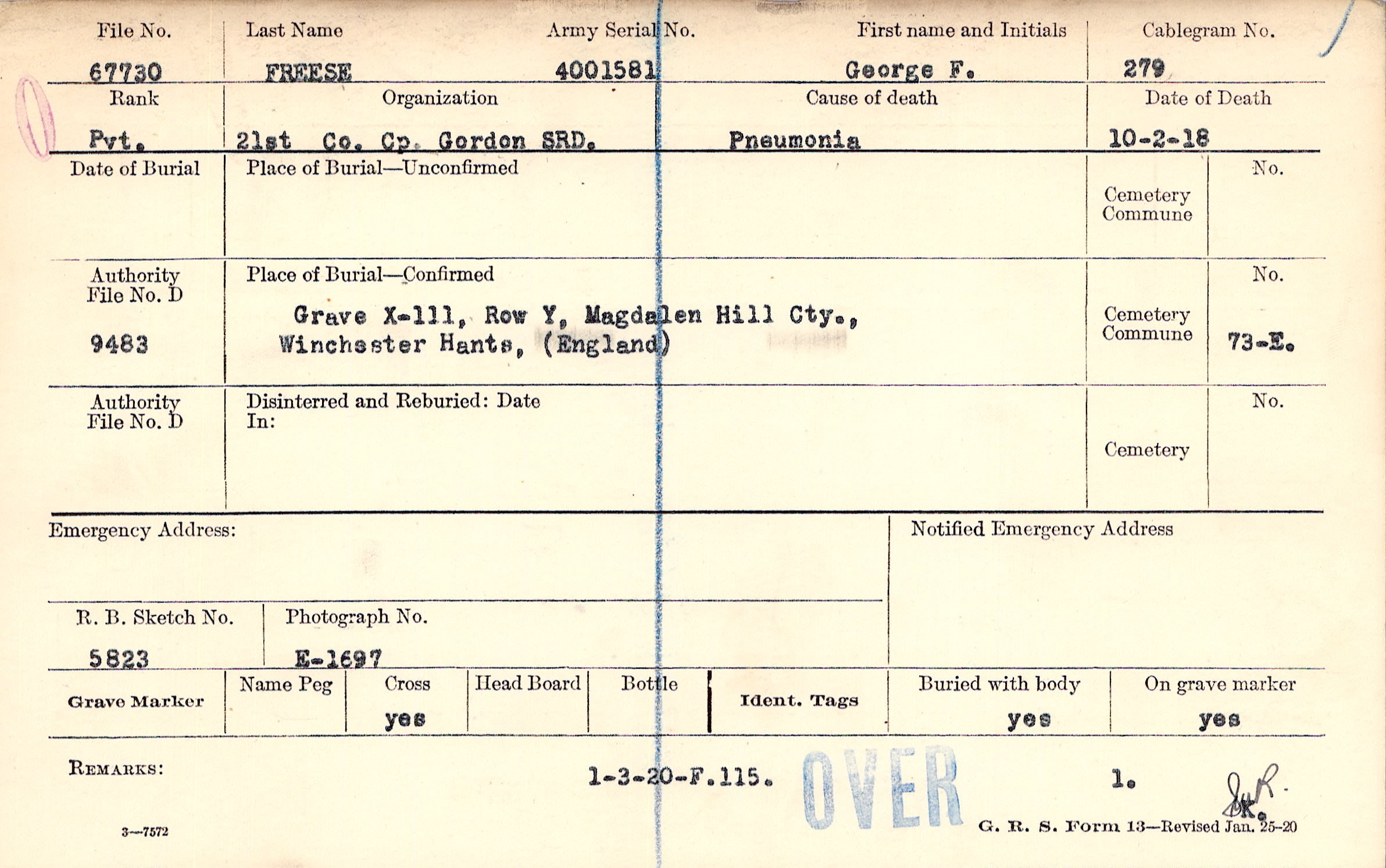 Grave X-111, Row Y, Magdalen Hill Cty., Winchester, Hants, England