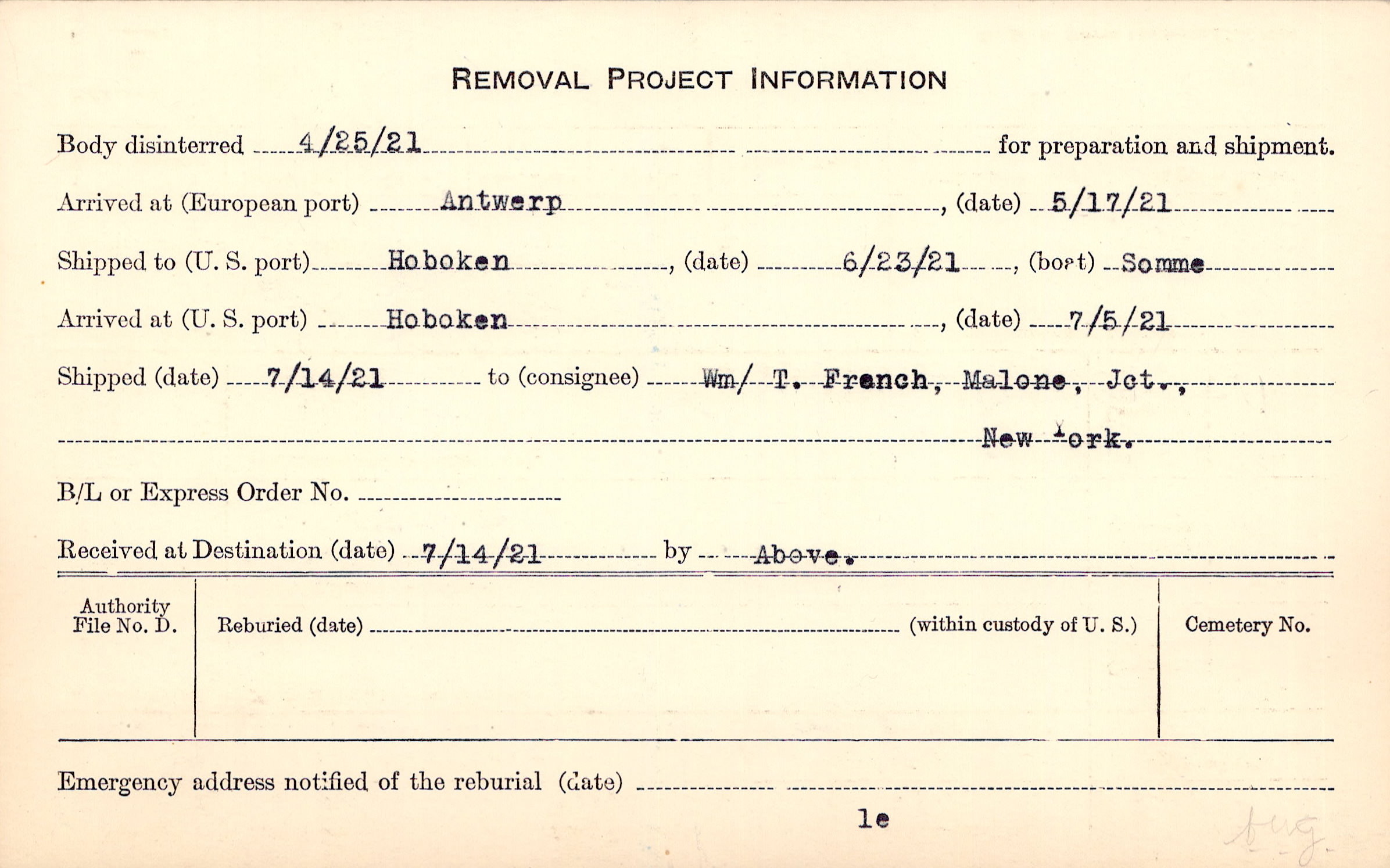 Body disinterred 4/25/1921 for preparation and shipment.