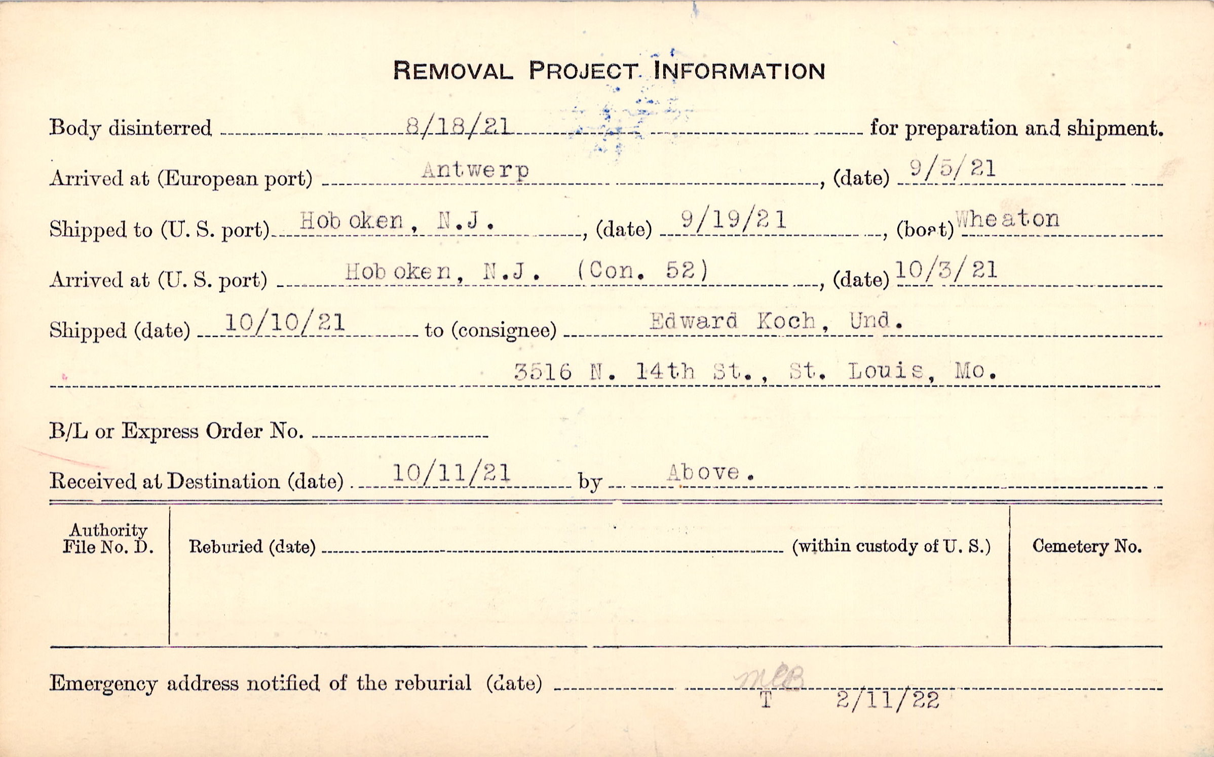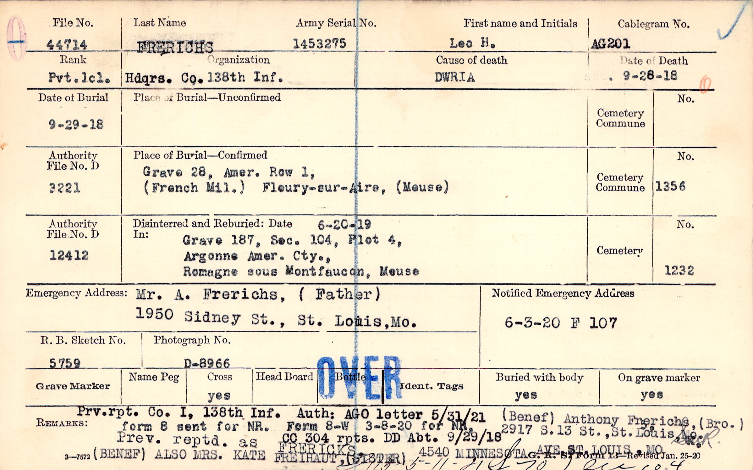 Prv. rpt. Co. I, 138th Inf. Auth: AGO letter 5/31/21 (Benef) Anthony Frerichs, (Bro.) 2917 S.13th St., St. Louis, Mo. Prev. reptd. as (BENEF) ALSO MRS. KATE FRERICKS FREIHAUT, (SISTER) 4540 MINNESOTA AVE., ST. LOUIS, MO. CC 305 rpts. DD Abt. 9/29/18, form 8 sent for NR., F115-5-11-21 (S70) Sec 104