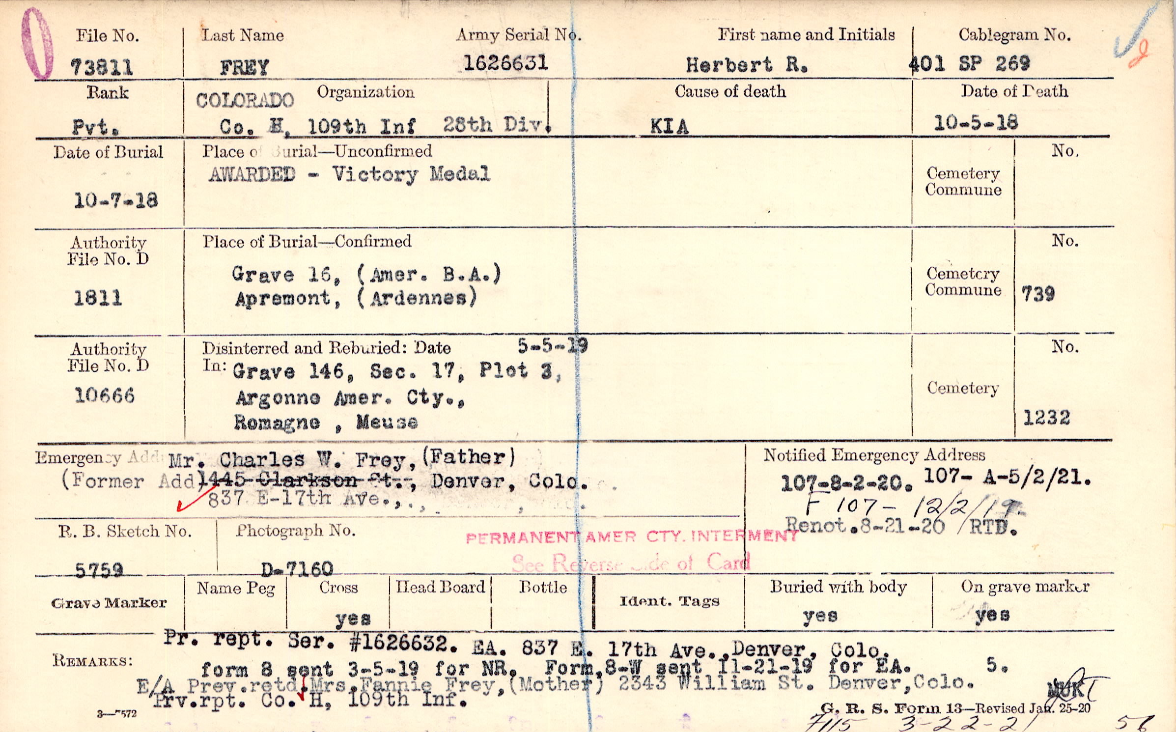 Pr. rept. Ser. #1626632. EA. 837 E. 17th Ave., Denver, Colo. E/A Prev. retd. Mrs. Fannie Frey, (Mother), 2343 William St., Denver, Colo. Prv. rpt. Co. H, 109th Inf., form 8 sent 3-5-19 for NR., F115 3-22-21 56