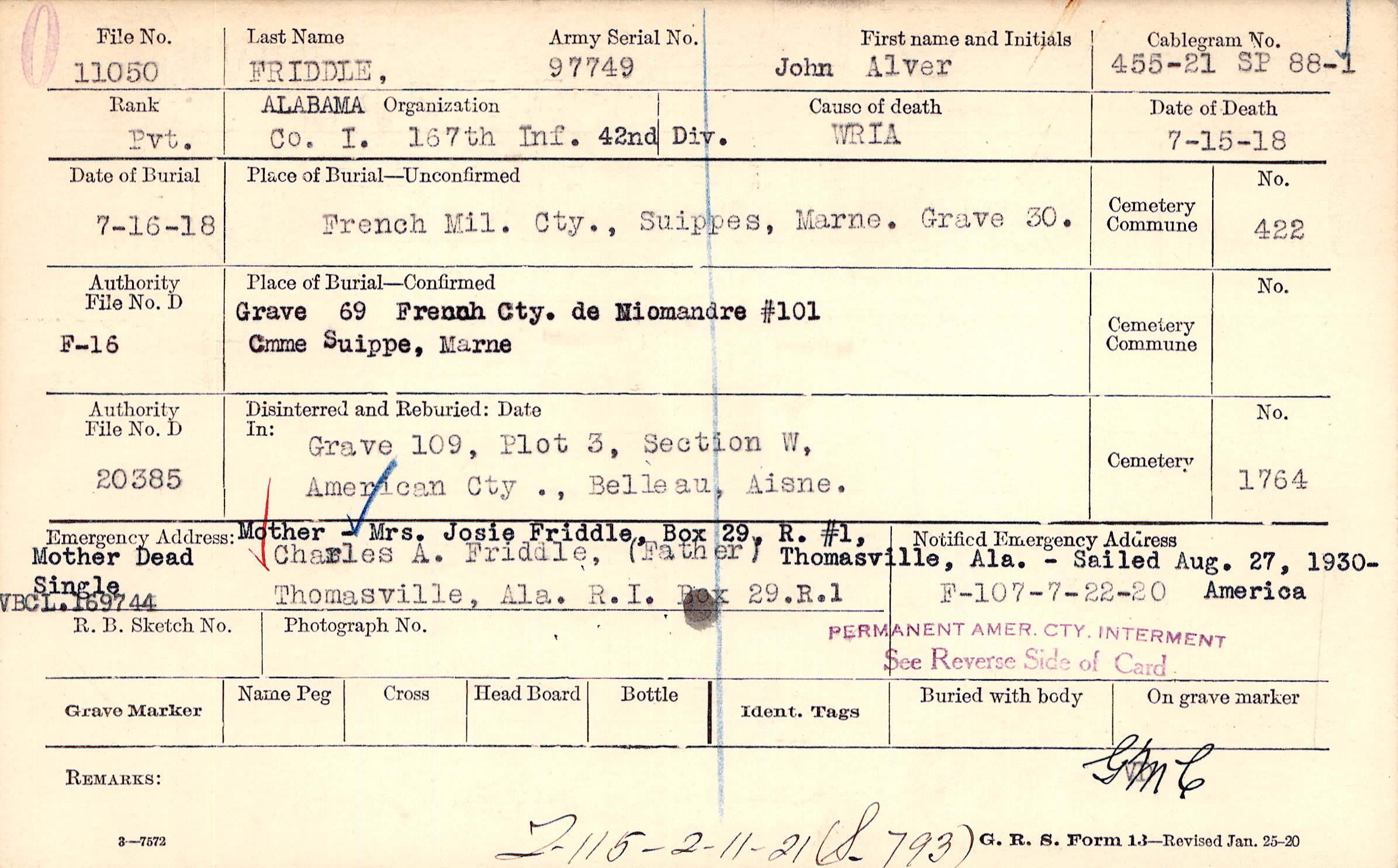 Charles A. Friddle, (Father), Thomasville, Ala. R.I. Box 29.R.1, Mother - Mrs Josie Friddle, Box 29, R. #1, Thomasville, Ala. - Sailed Aug. 27, 1930- America Mother Dead Single VBCL.169744