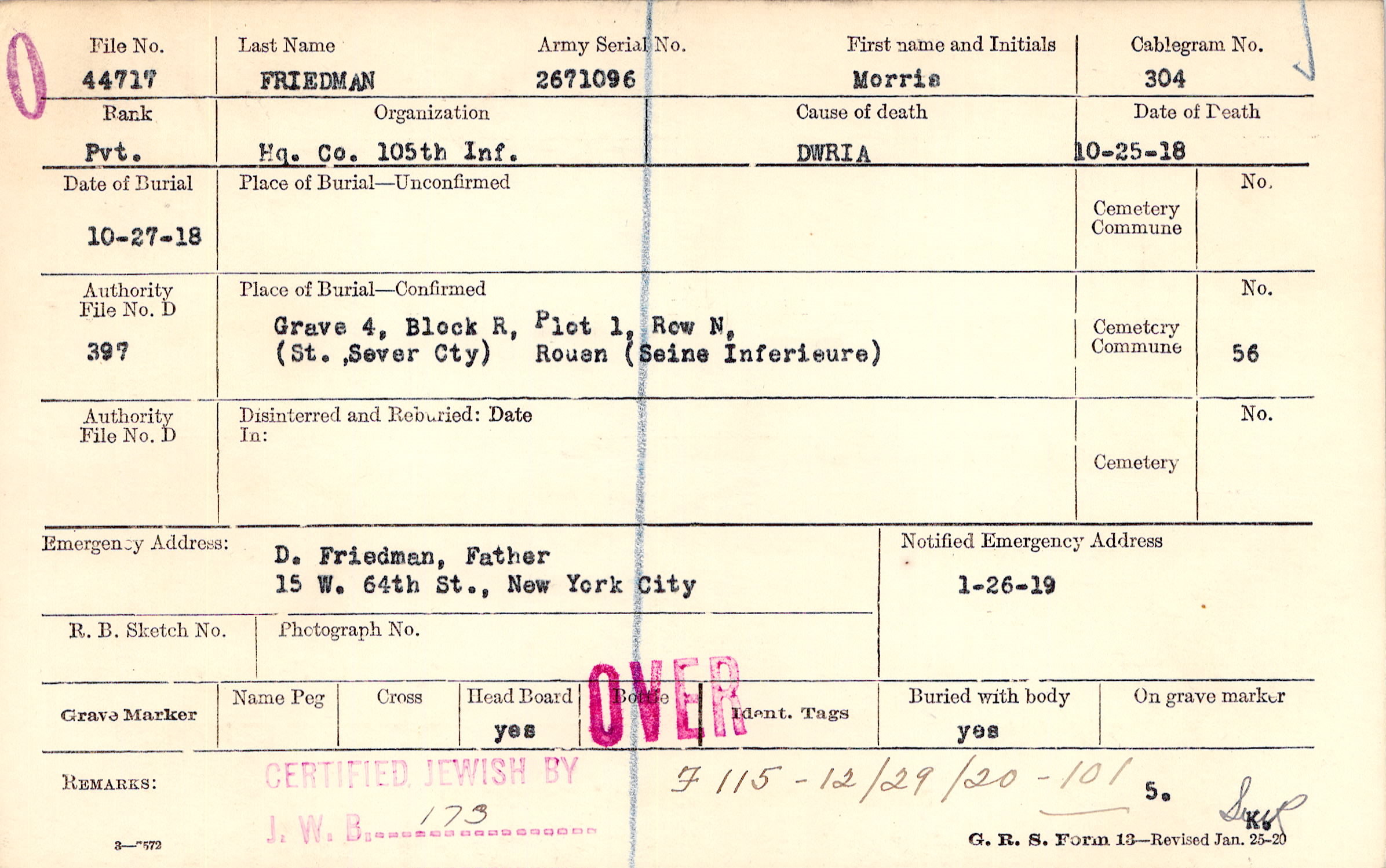 Grave 4, Block R, Plot 1, Row N, (St. Sever Cty), Rouen (Seine Inferieure)
