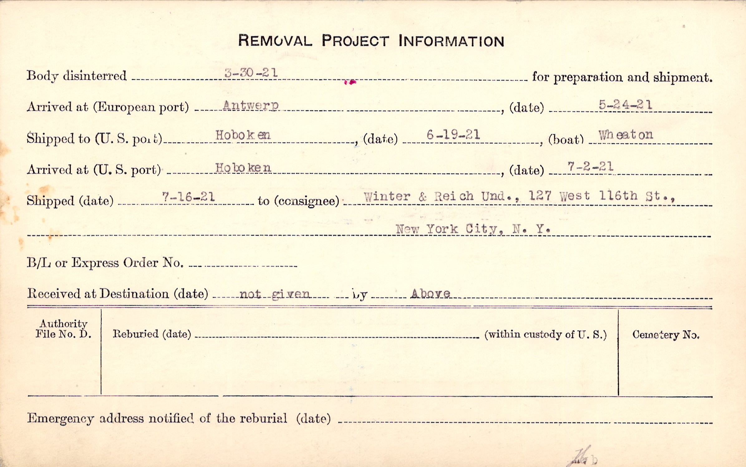 Body disinterred 3/30/1921 for preparation and shipment.