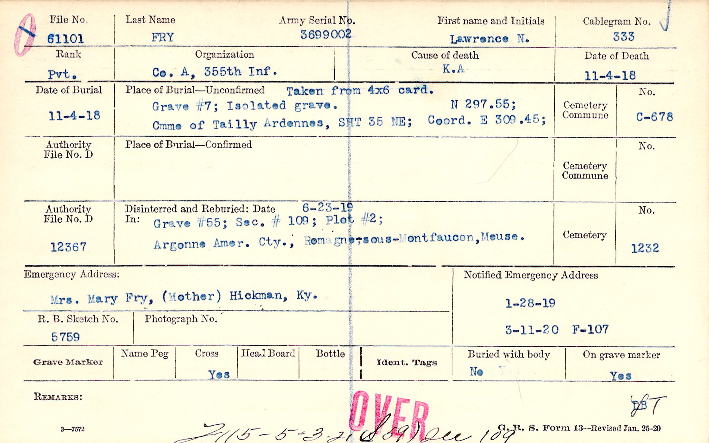 Grave 55, Section 109, Plot 2, Argonne American Cemetery, Romagne-sous-Montfaucon, Meuse