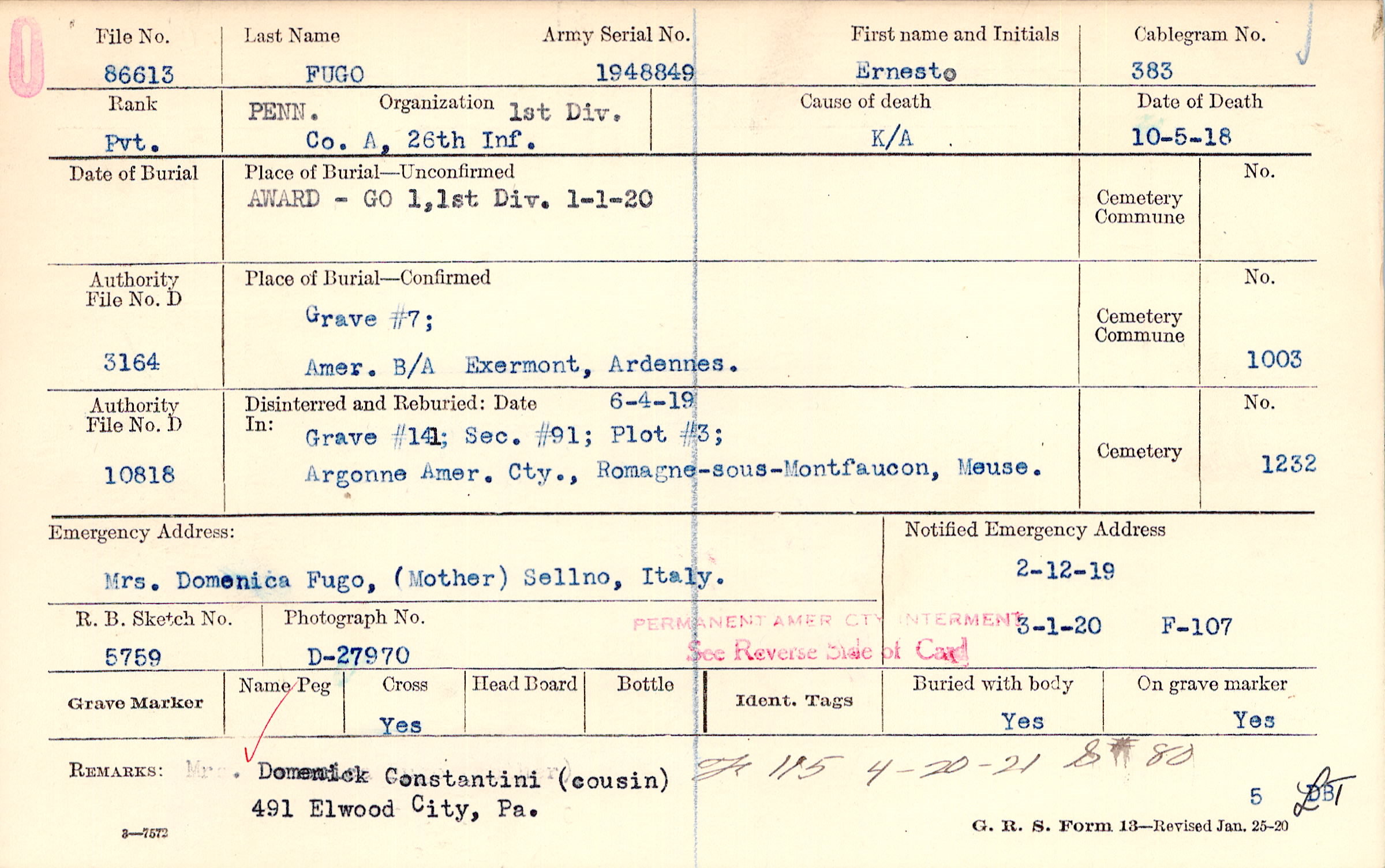 Mrs. Domenica Fugo, (Mother), Sellno, Italy