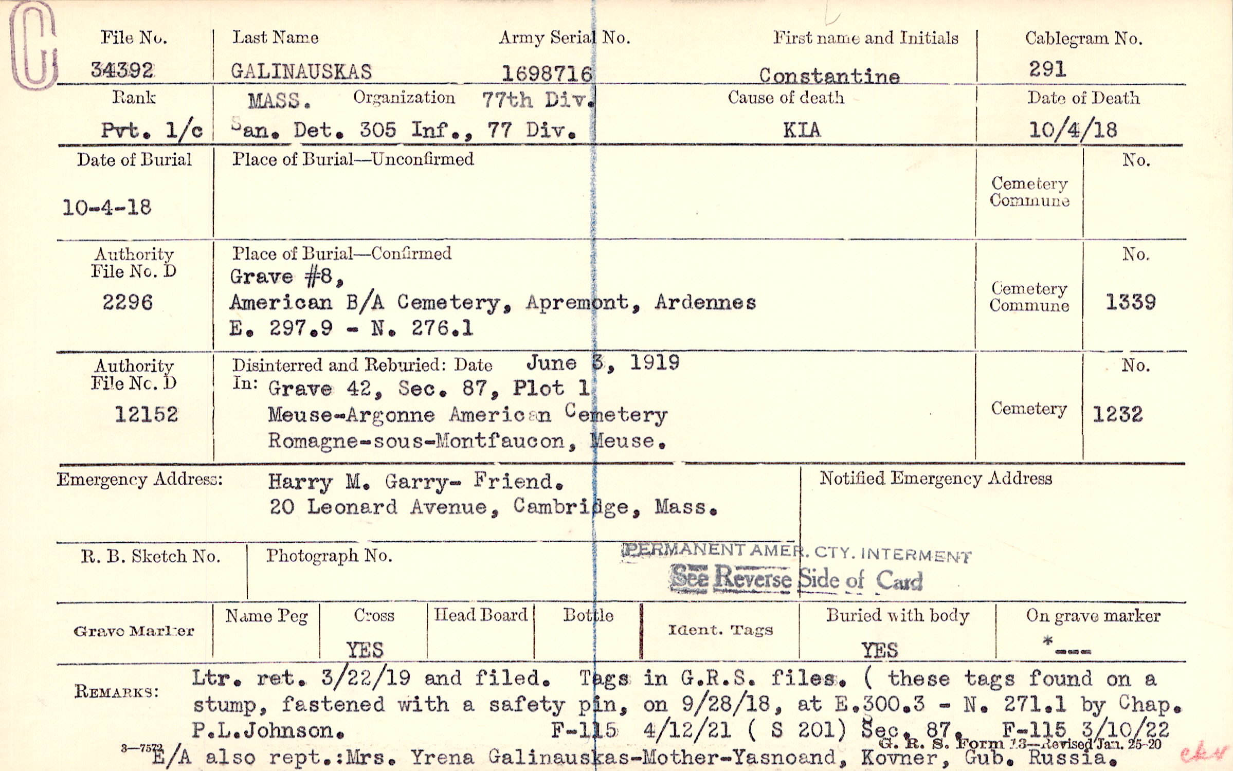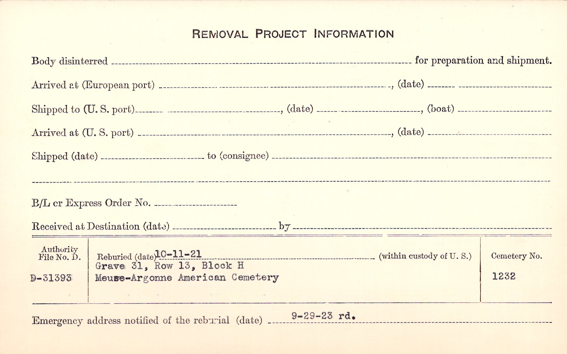 | Permanent Burial in Foreign Cemetery |