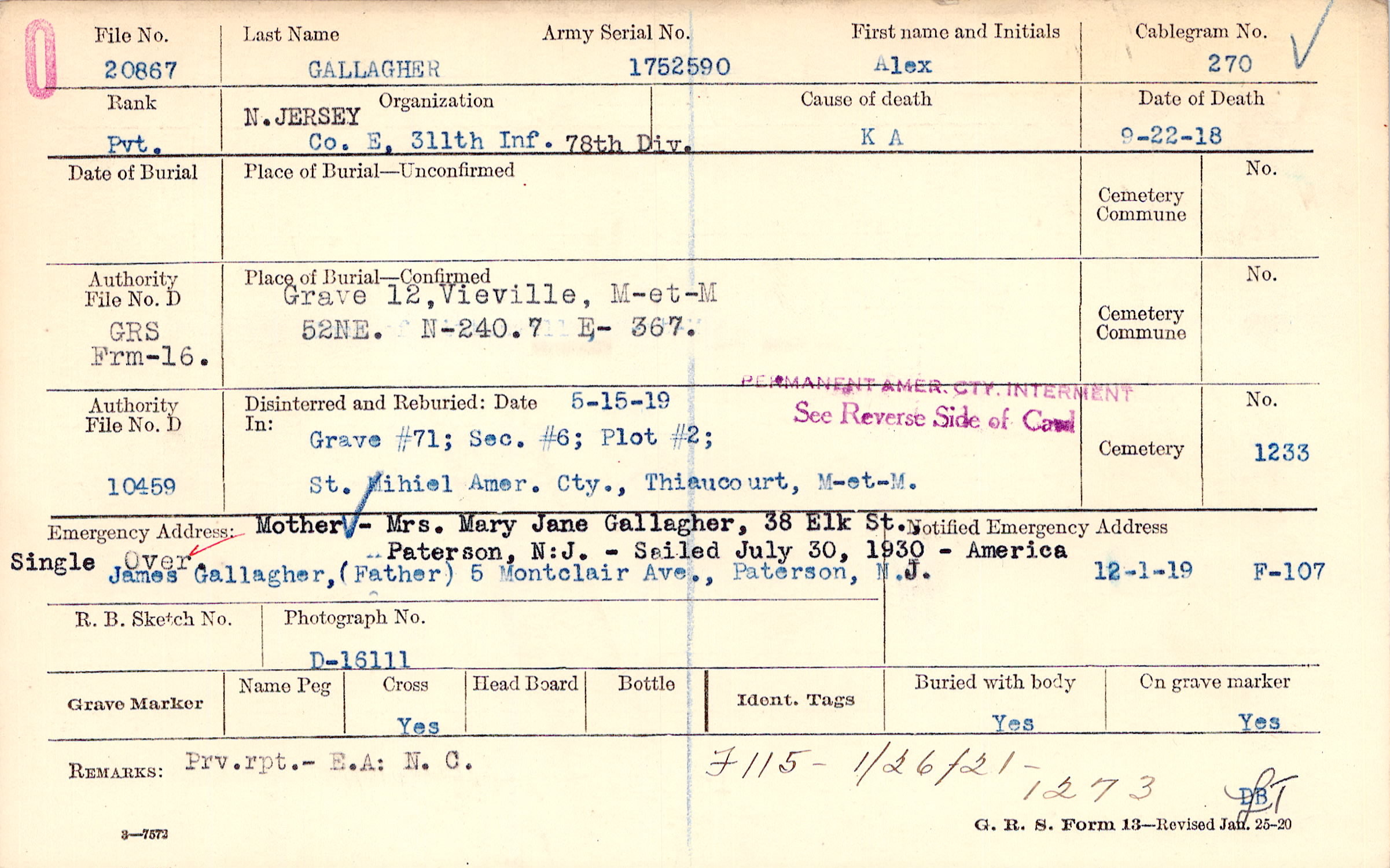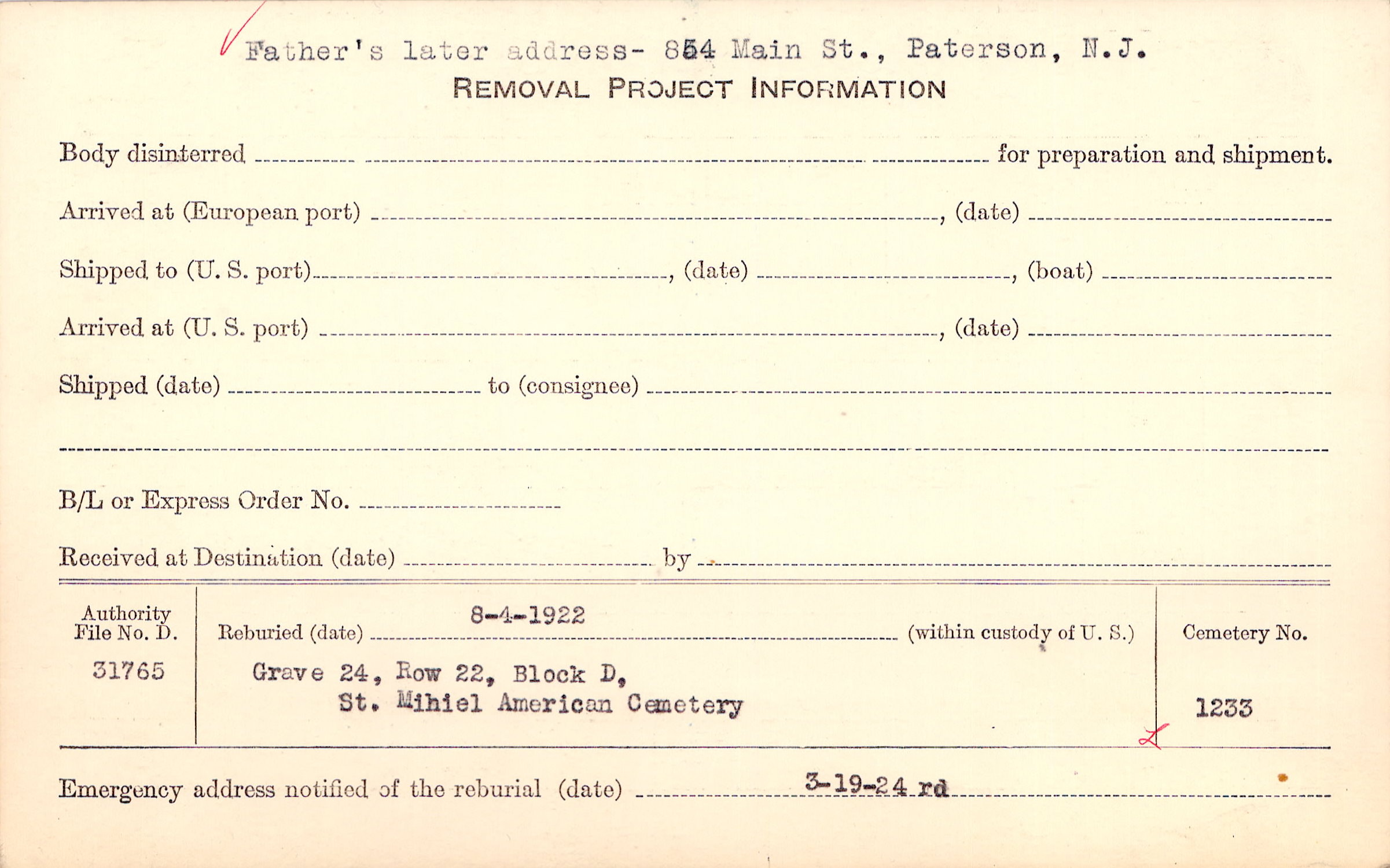 Father's later address- 854 Main St., Patterson, N.J. |