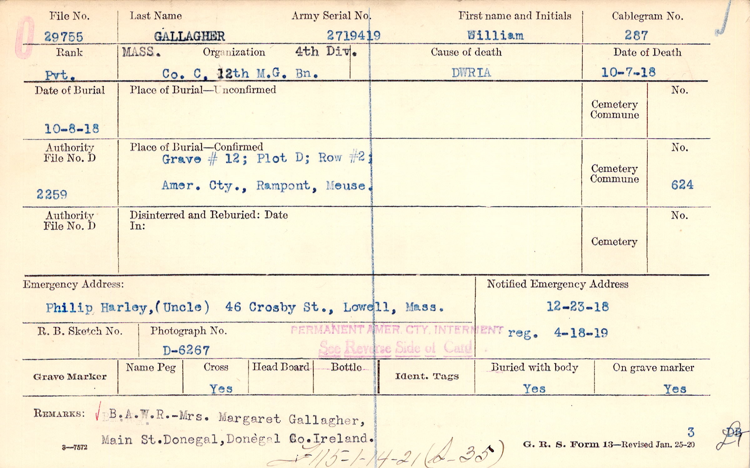Grave # 12, Plot D, Row #2, Amer. Cty., Rampont, Meuse