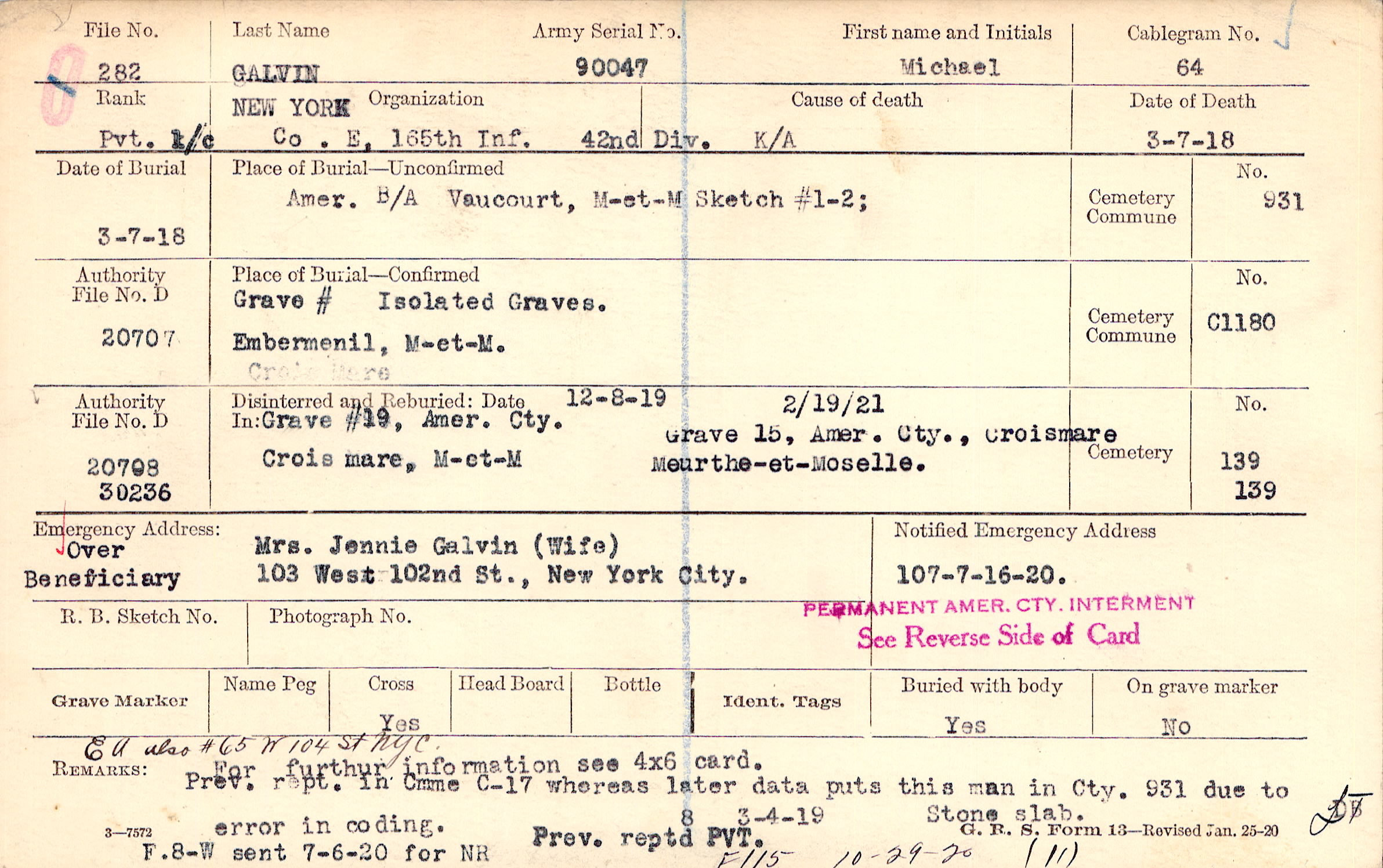 Mrs. Jennie Galvin (Wife), 103 West 102nd St . , New York City., Over Beneficiary