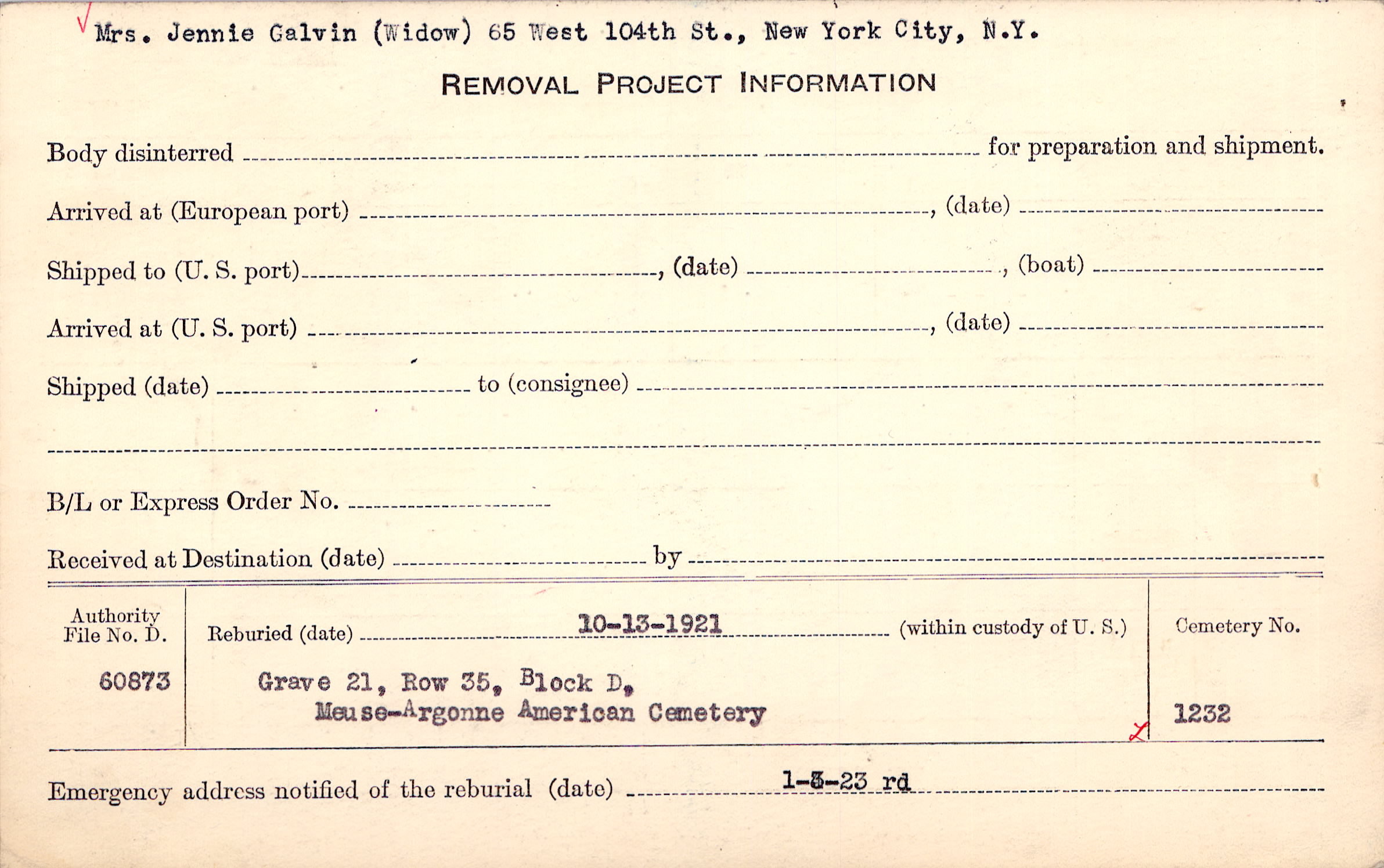 Mrs. Jennie Galvin (Widow) 65 West 104th St., New York City, N.Y. |