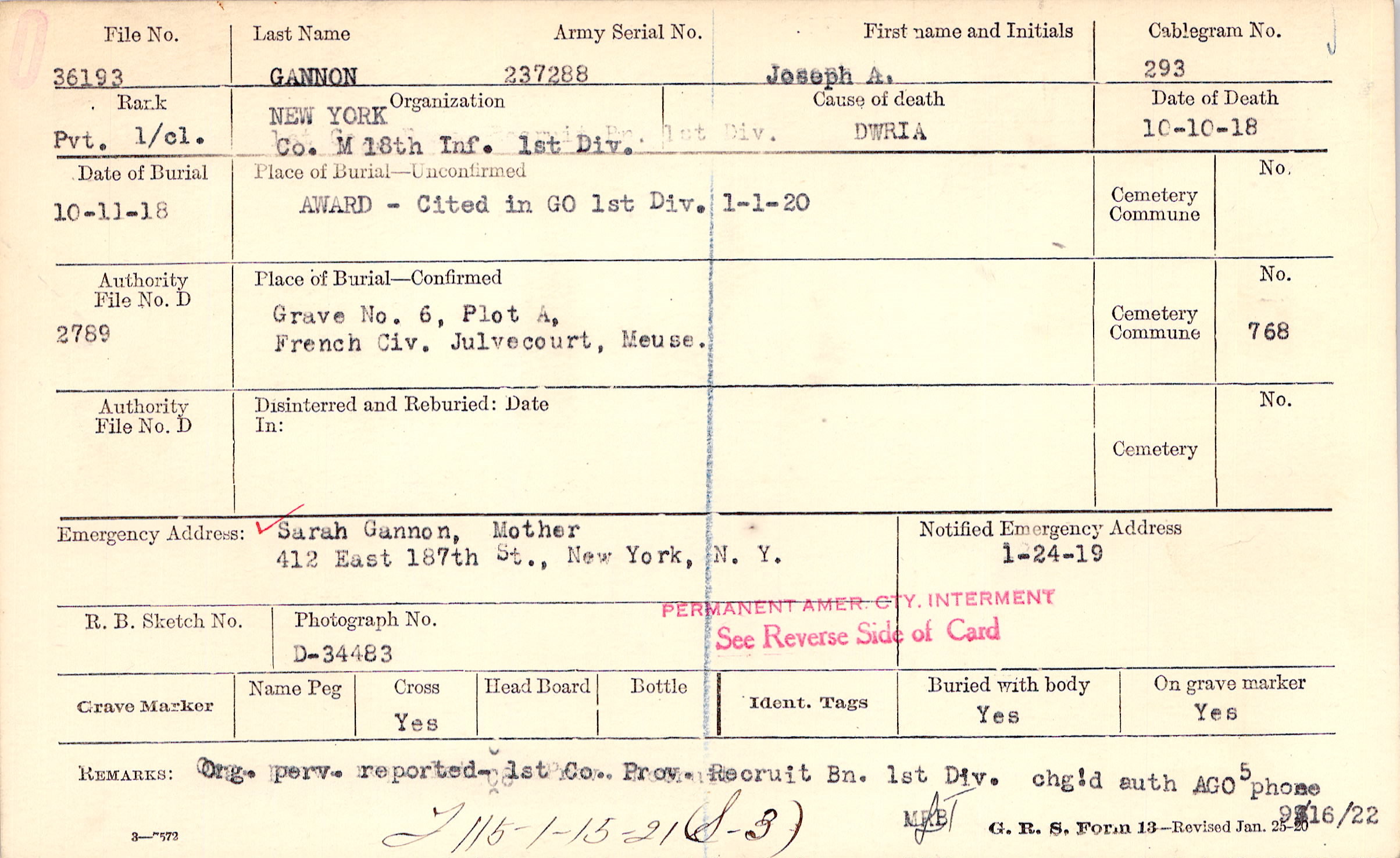Sarah Gannon, Mother, 412 East 187th St., New York, N. Y.