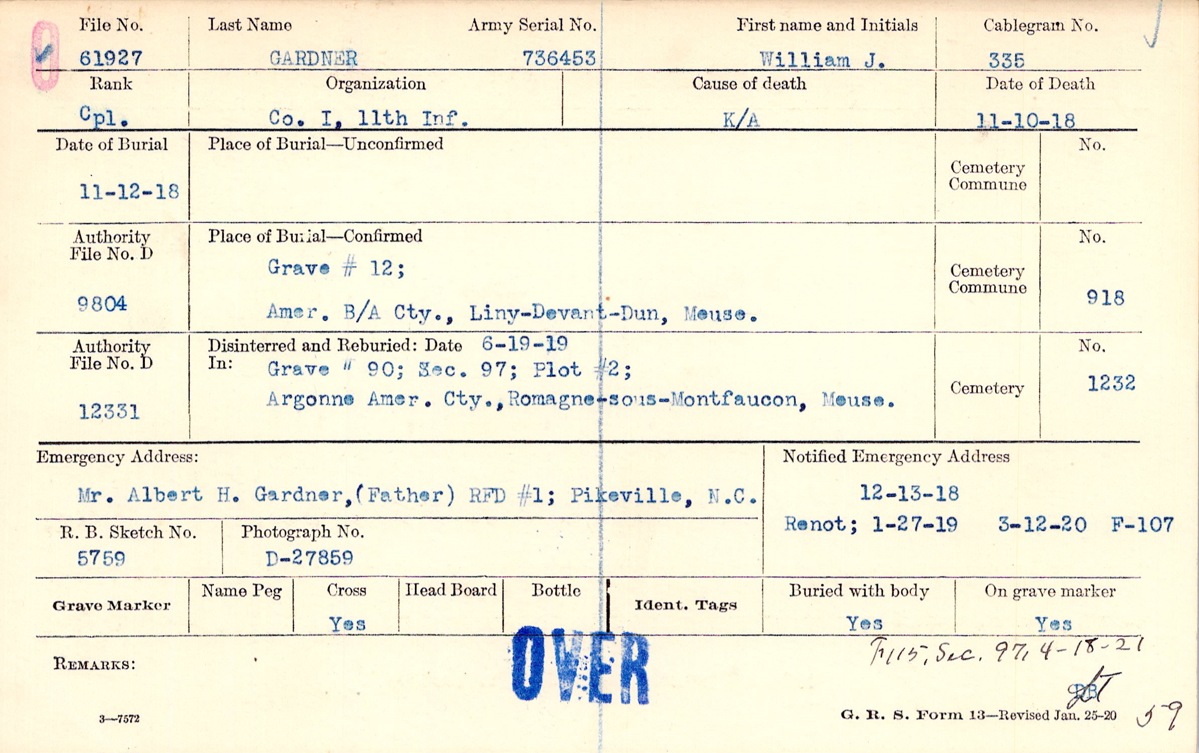 12/13/1918, Renot; 1/27/1919, Form 107: 3/12/1920
