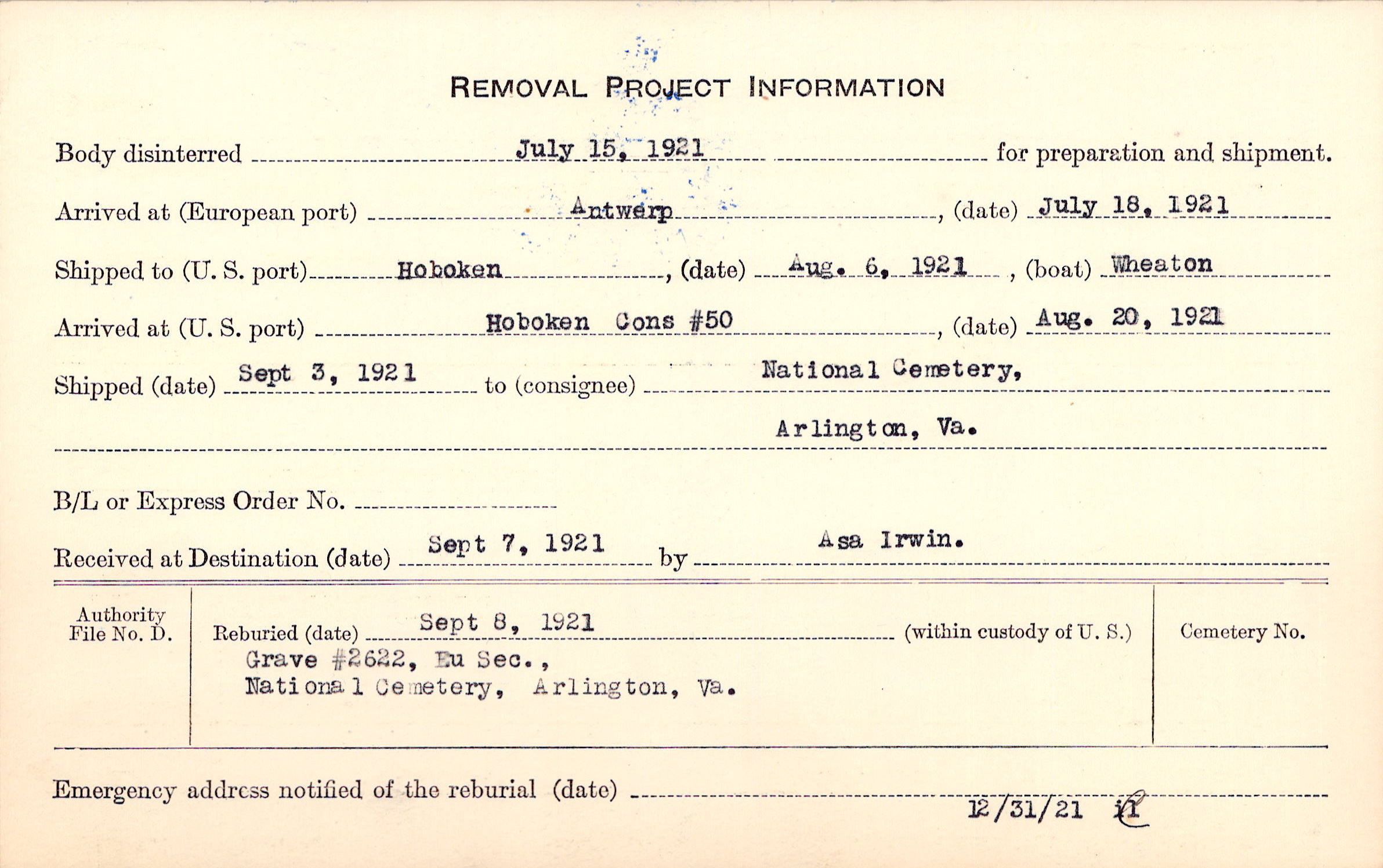 Body disinterred 7/15/1921 for preparation and shipment.