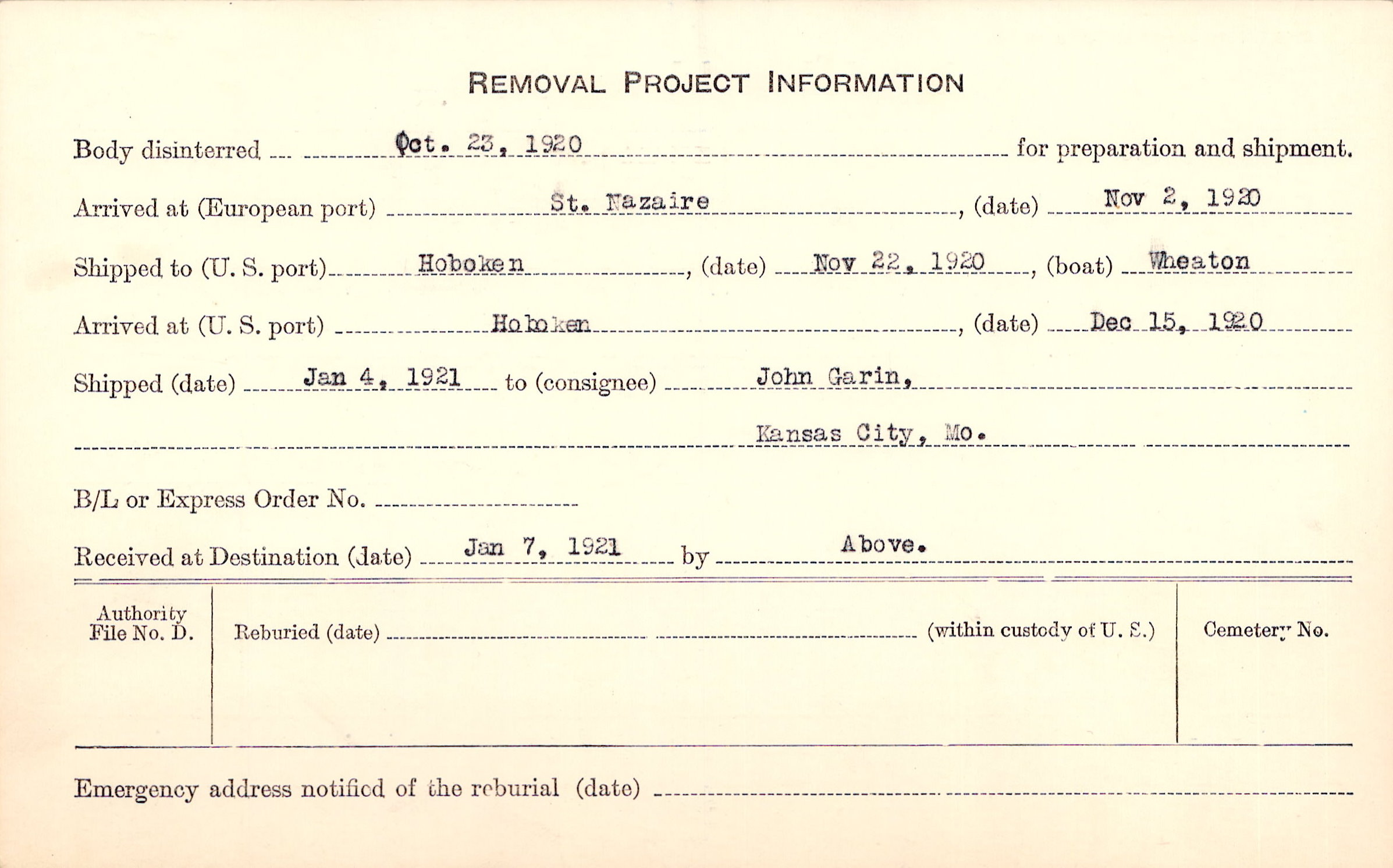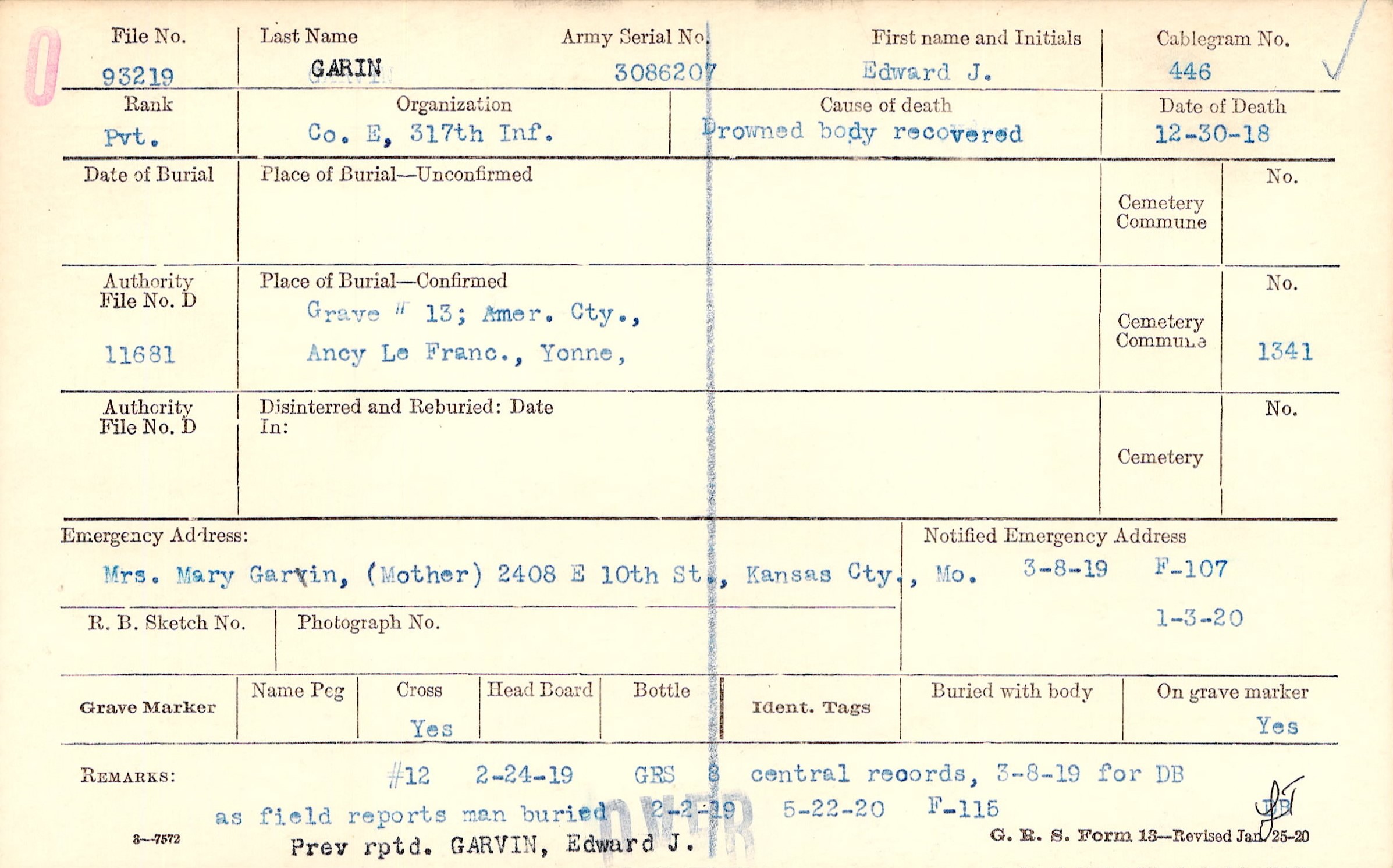Mrs. Mary Garvin, (Mother), 2408 E 10th St., Kansas Cty., Mo.