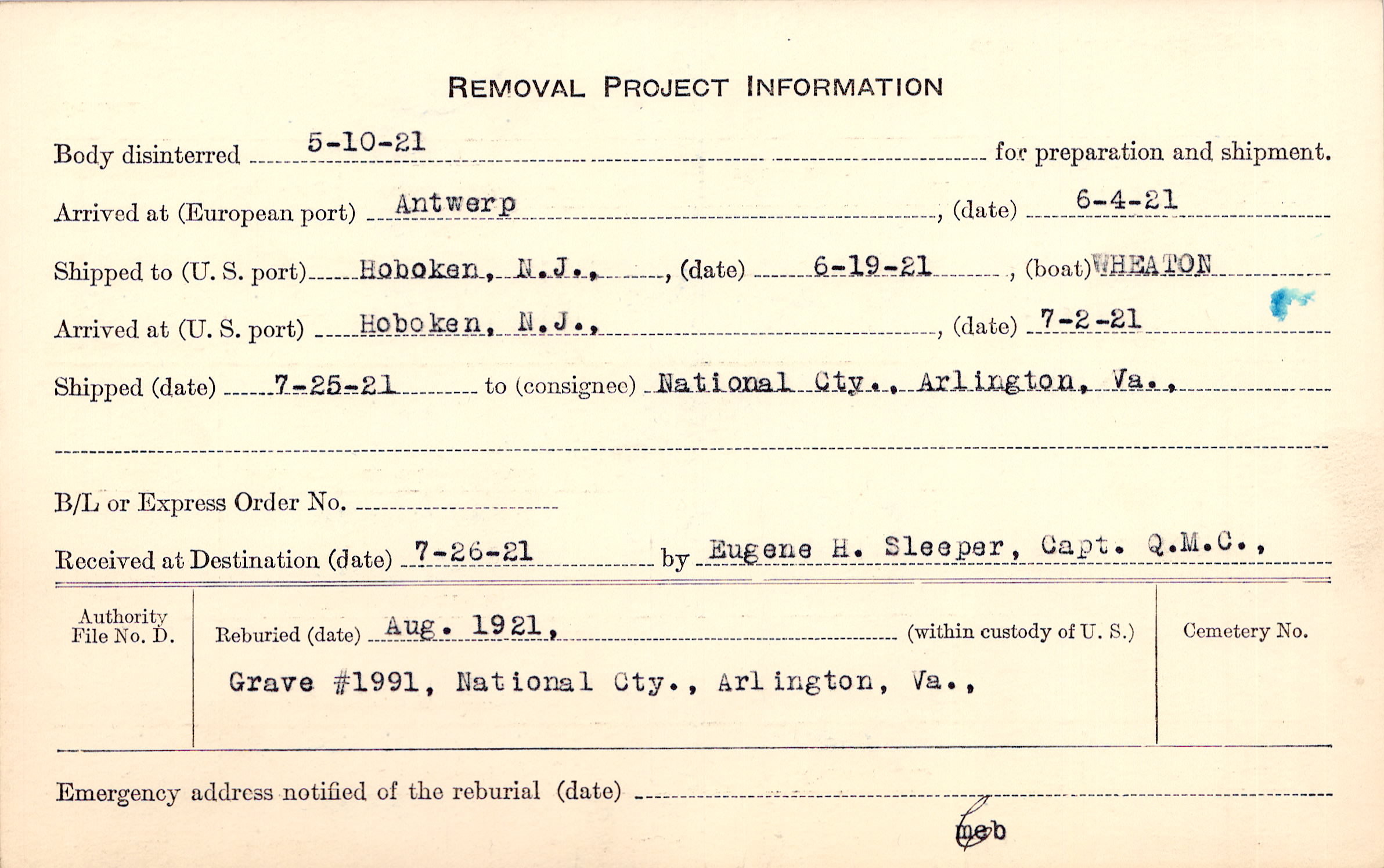 Body disinterred 5/10/1921 for preparation and shipment.