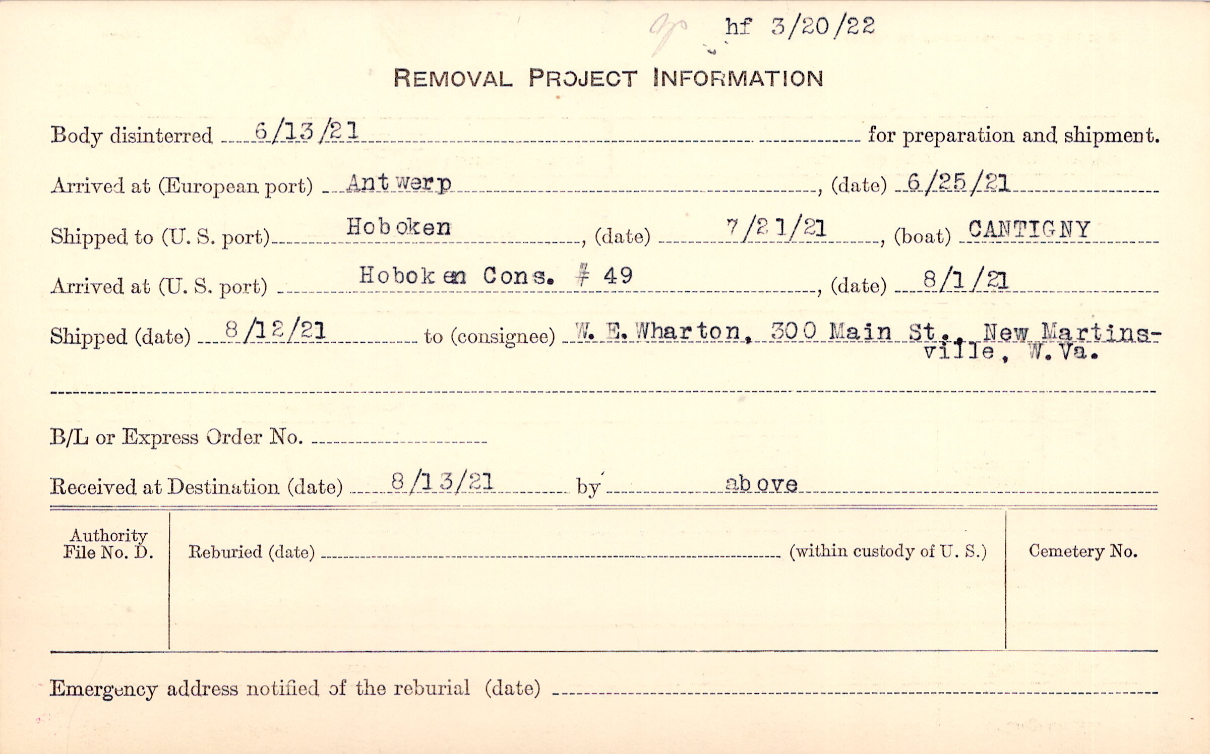 Body disinterred 6/13/1921 for preparation and shipment.