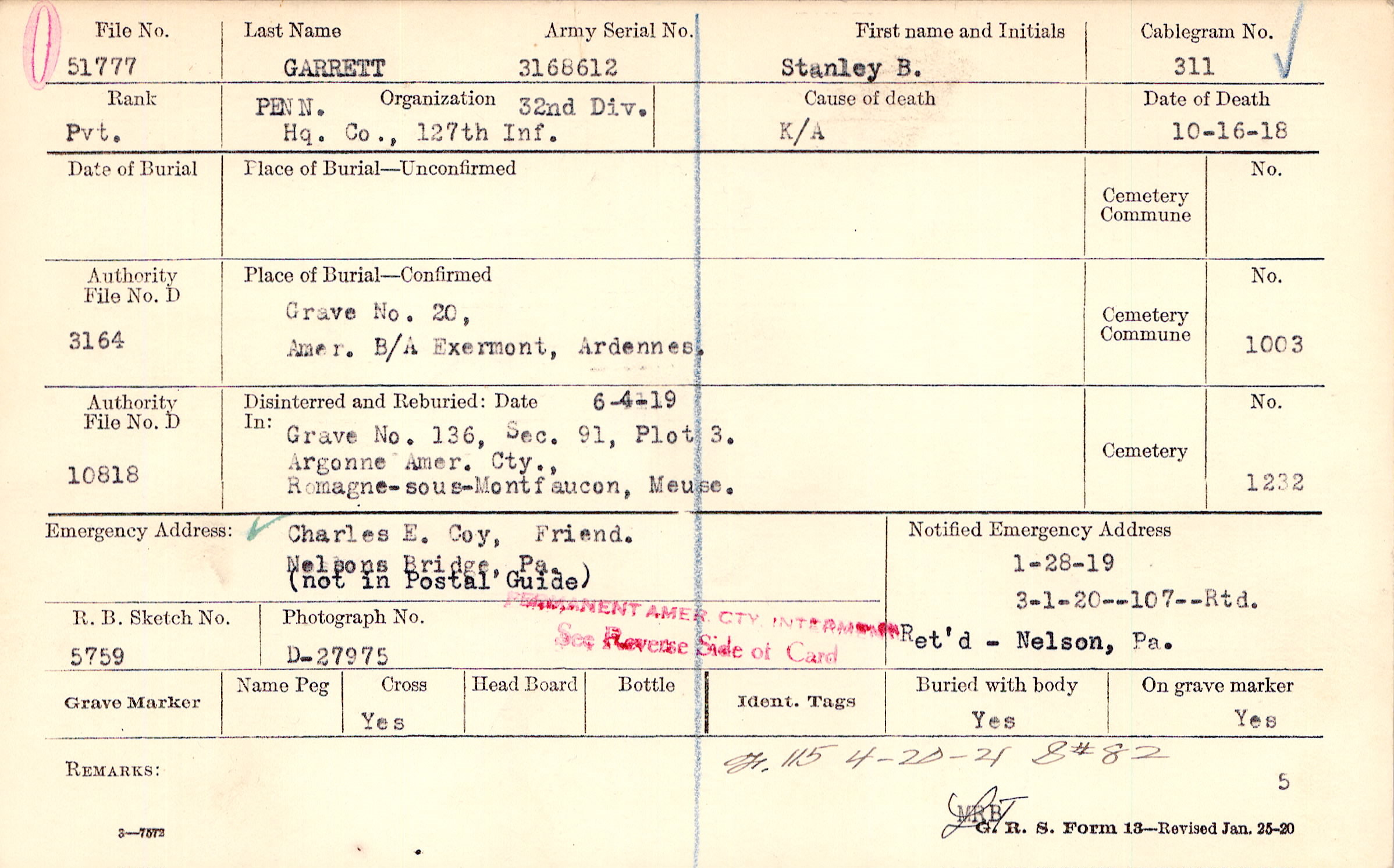 1/28/1919, 3/1/1920 107 Rtd, Ret'd Nelson, Pa