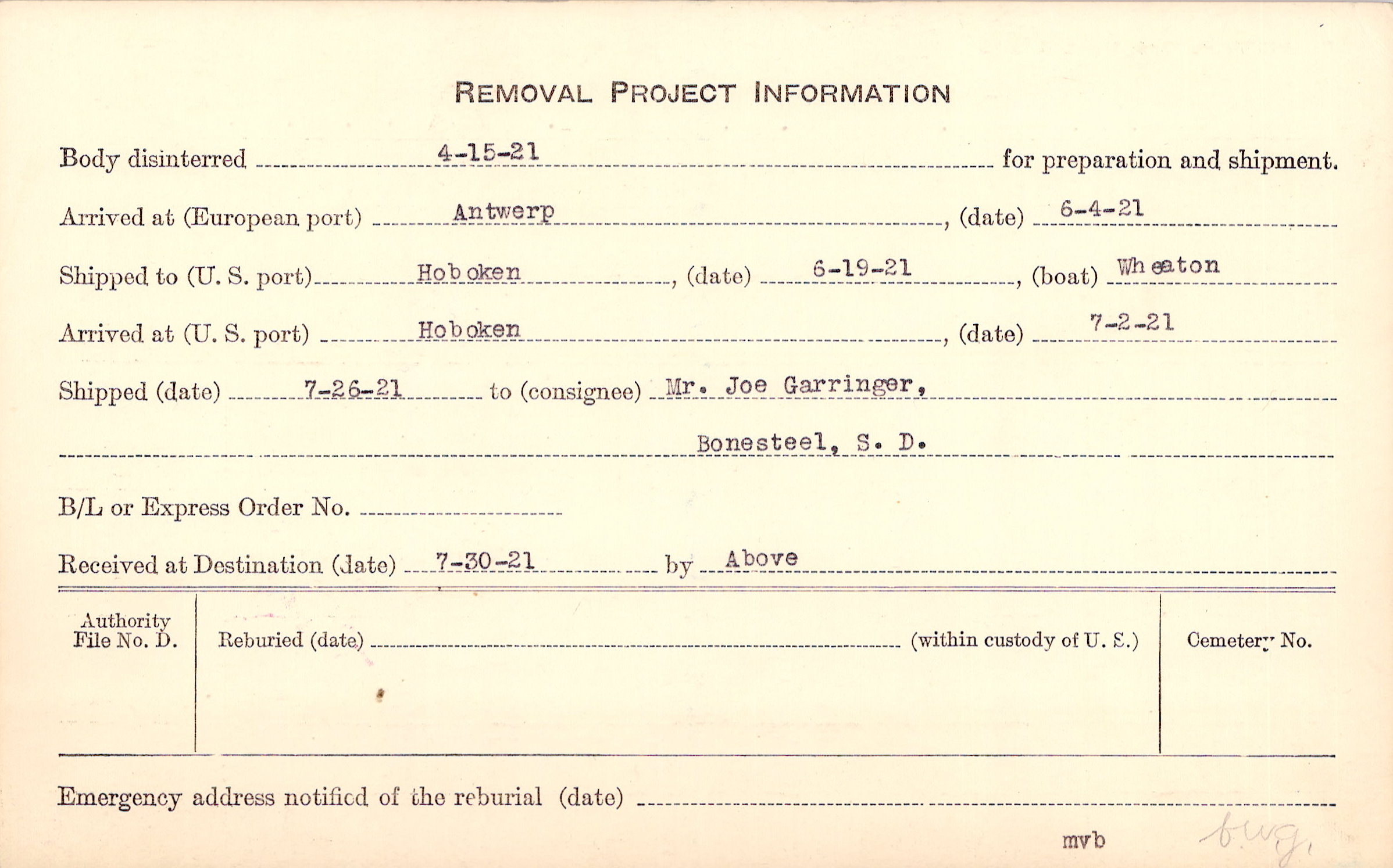 to Mr. Joe Garringer, Bonesteel, S. D.
