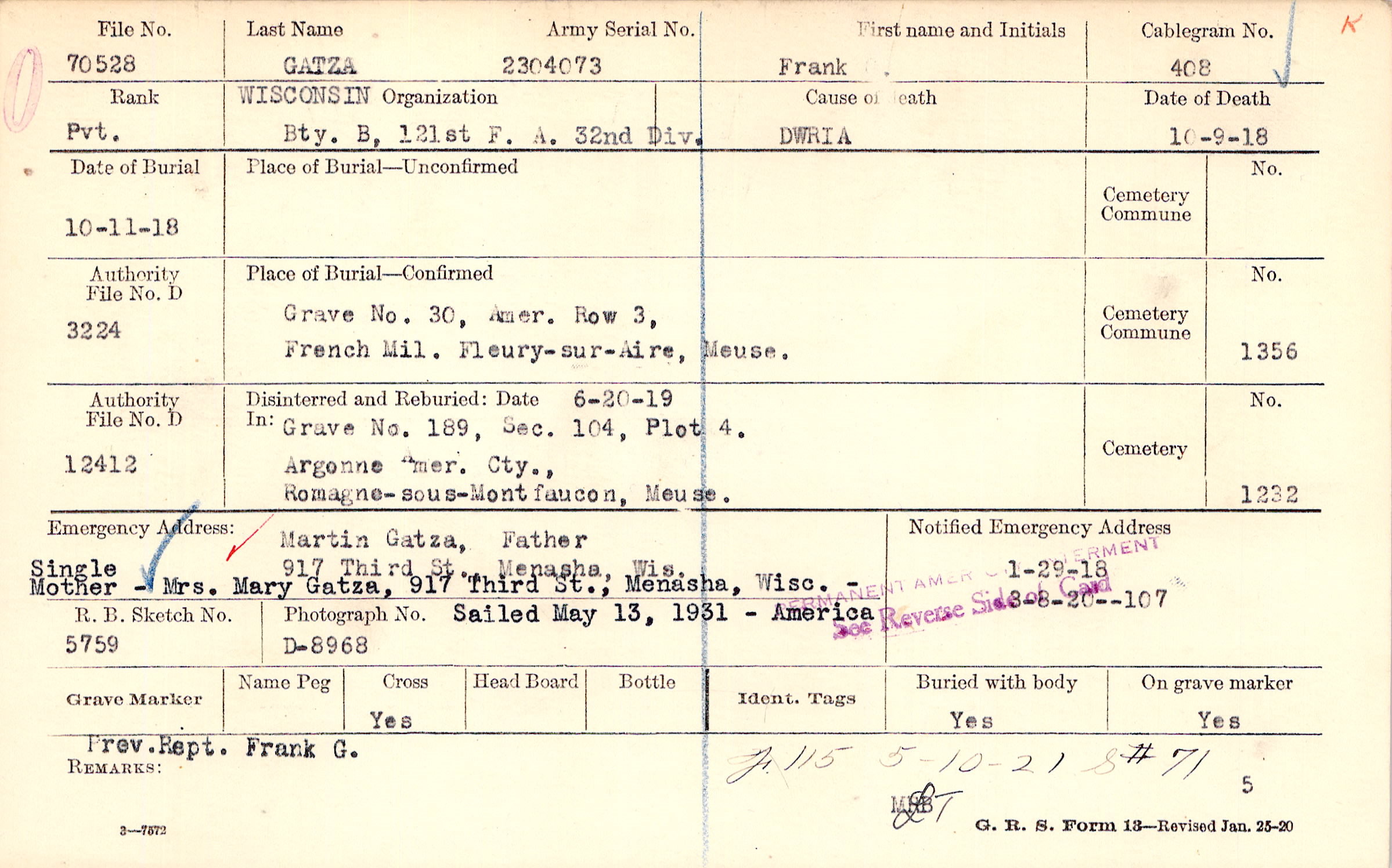 Martin Gatza, Father, 917 Third St., Menasha, Wis., Single Mother - Mrs. Mary Gatza, 917 Third St., Menasha, Wisc. - Sailed May 13, 1931 - America