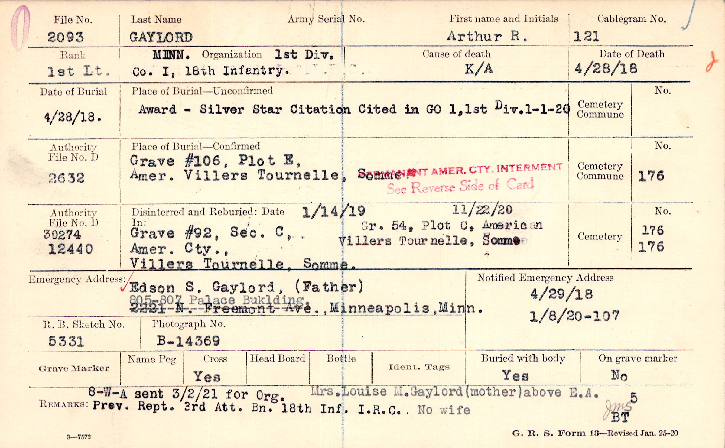 Mrs. Louise M. Gaylord (mother) above E.A. No wife, 8-W-A sent 3/2/21 for Org.