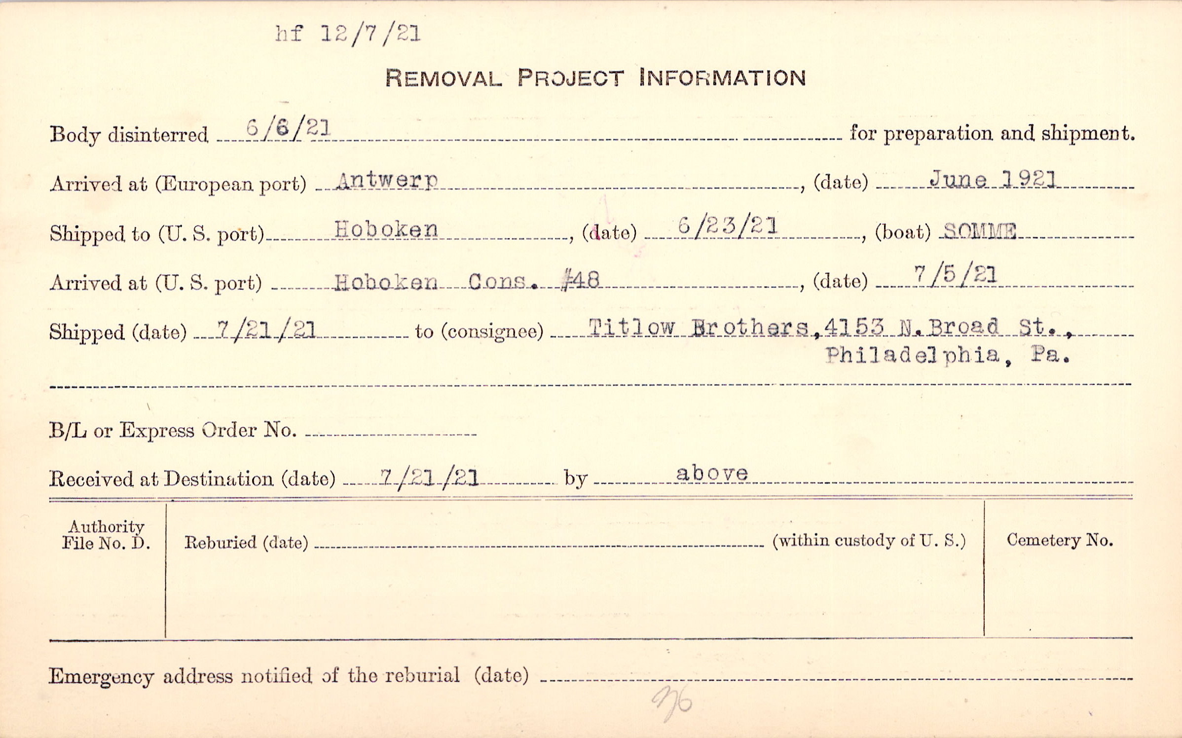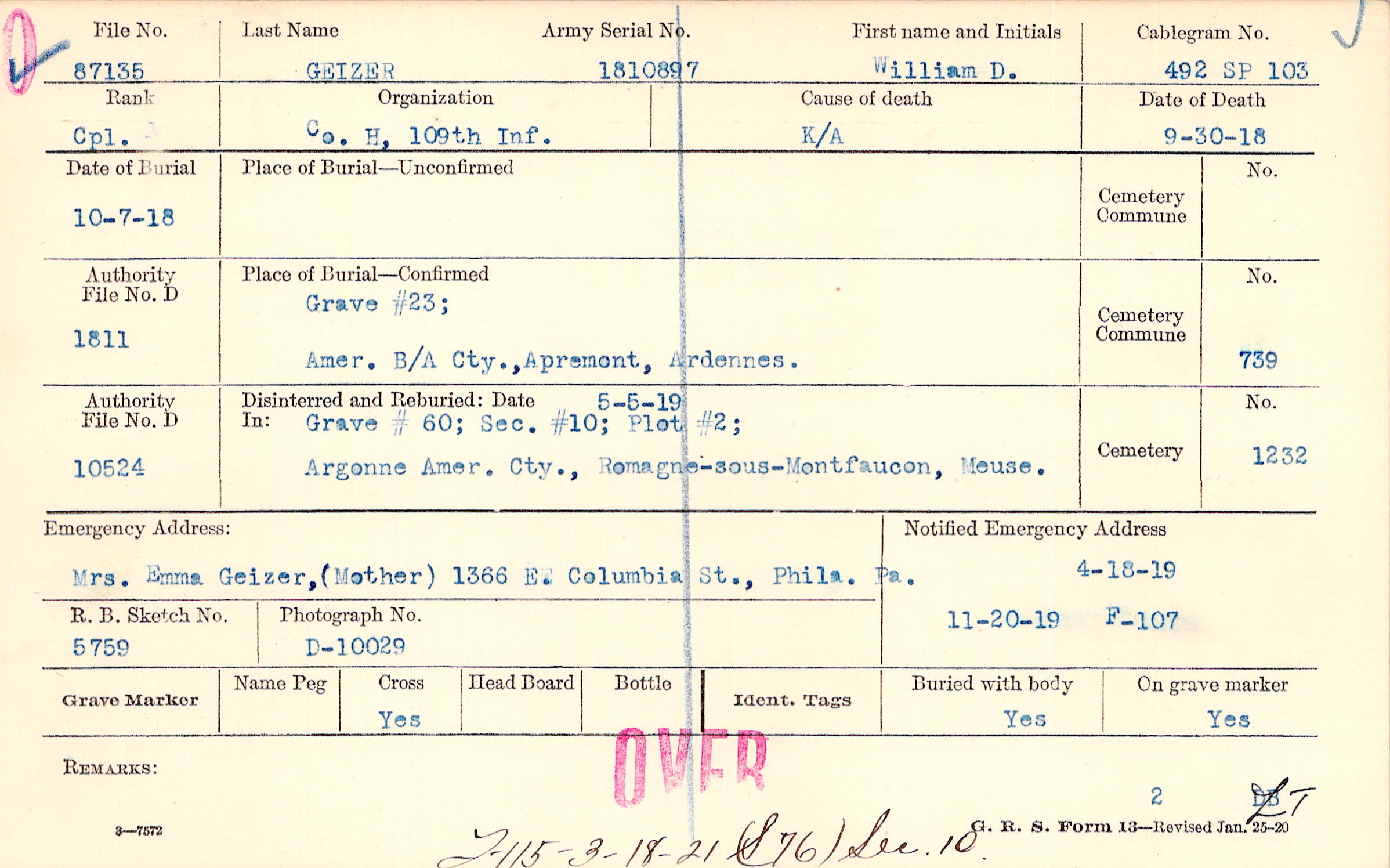 Mrs. Emma Geizer, (Mother), 1366 E. Columbia St., Phila. Pa.
