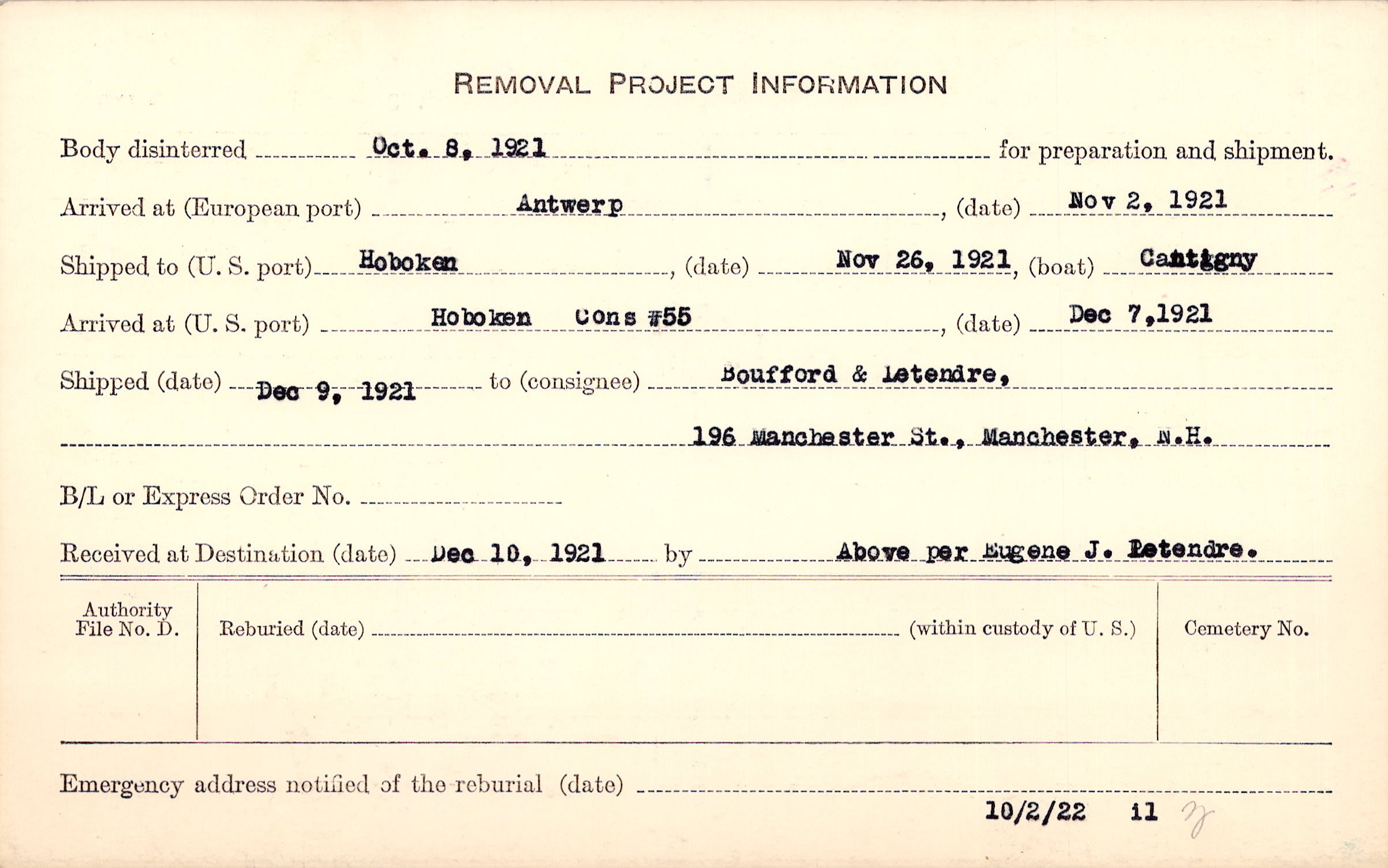 Body disinterred 10/8/1921 for preparation and shipment.