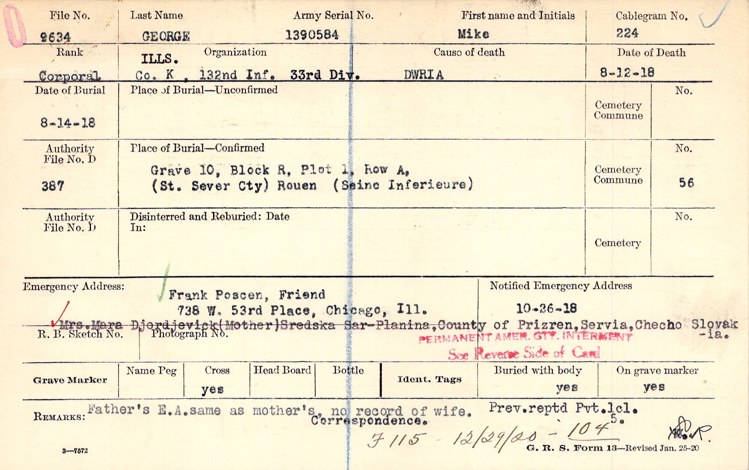 Father's E.A. same as mother's, no record of wife. Prev. rptd. Pvt. lcl. Correspondence., F 115 12/29/20 - 104