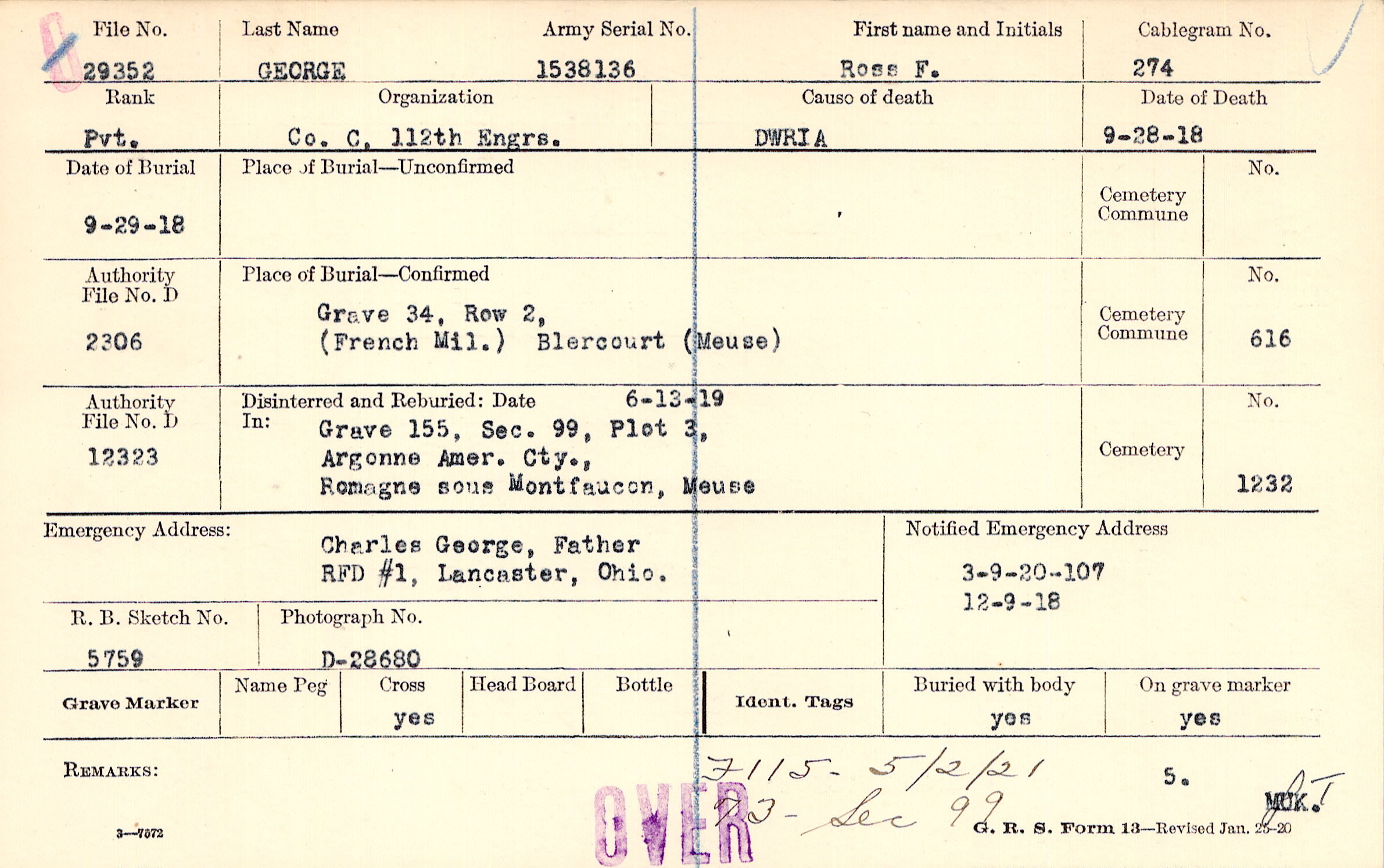 Charles George, Father, RFD #1, Lancaster, Ohio.