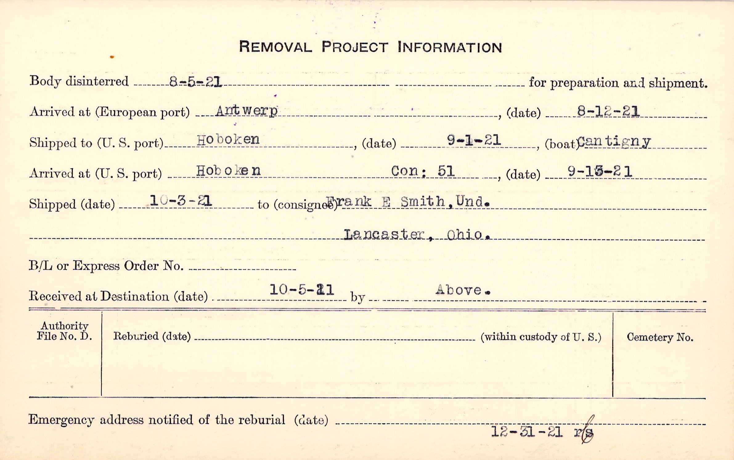 Body disinterred 8/5/1921 for preparation and shipment.
