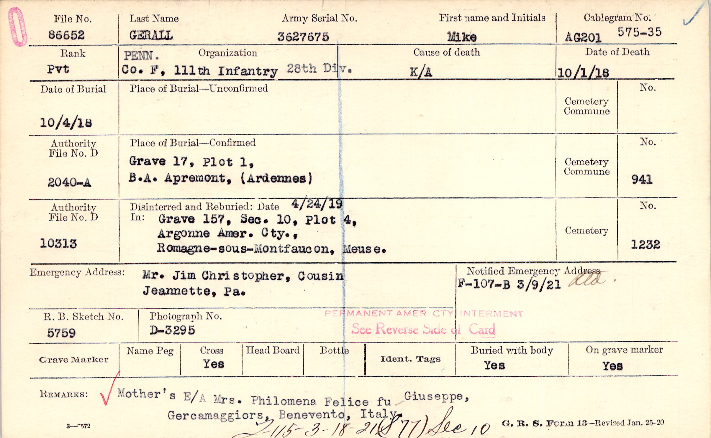 Mother's E/A Mrs. Philomena Felice fu Guiseppe, Gercamaggiors, Benovento, Italy, F115-3-18-21 (S77), Sec 10