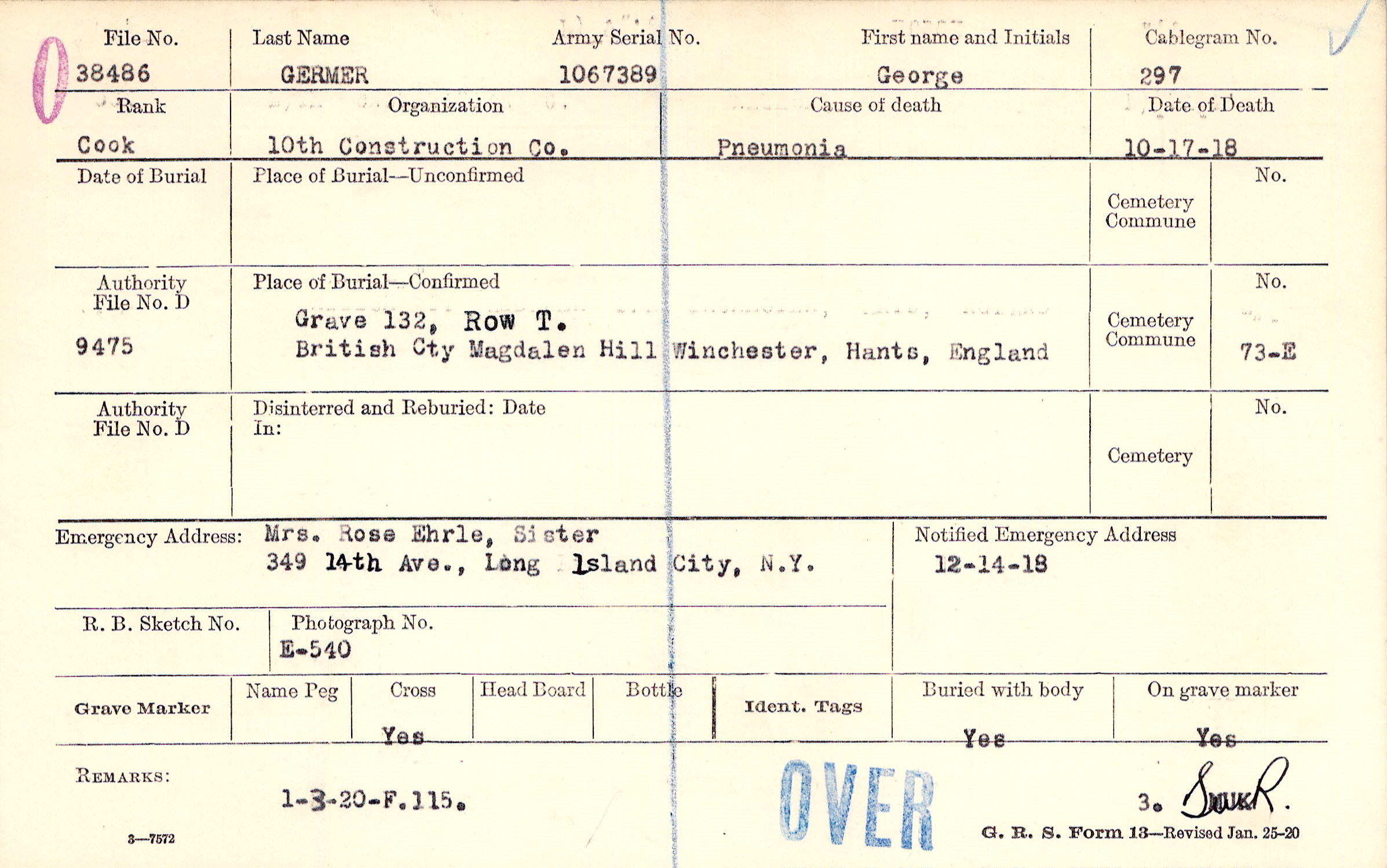 Mrs. Rose Ehrle, Sister, 349 14th Ave., Long Island City, N.Y.
