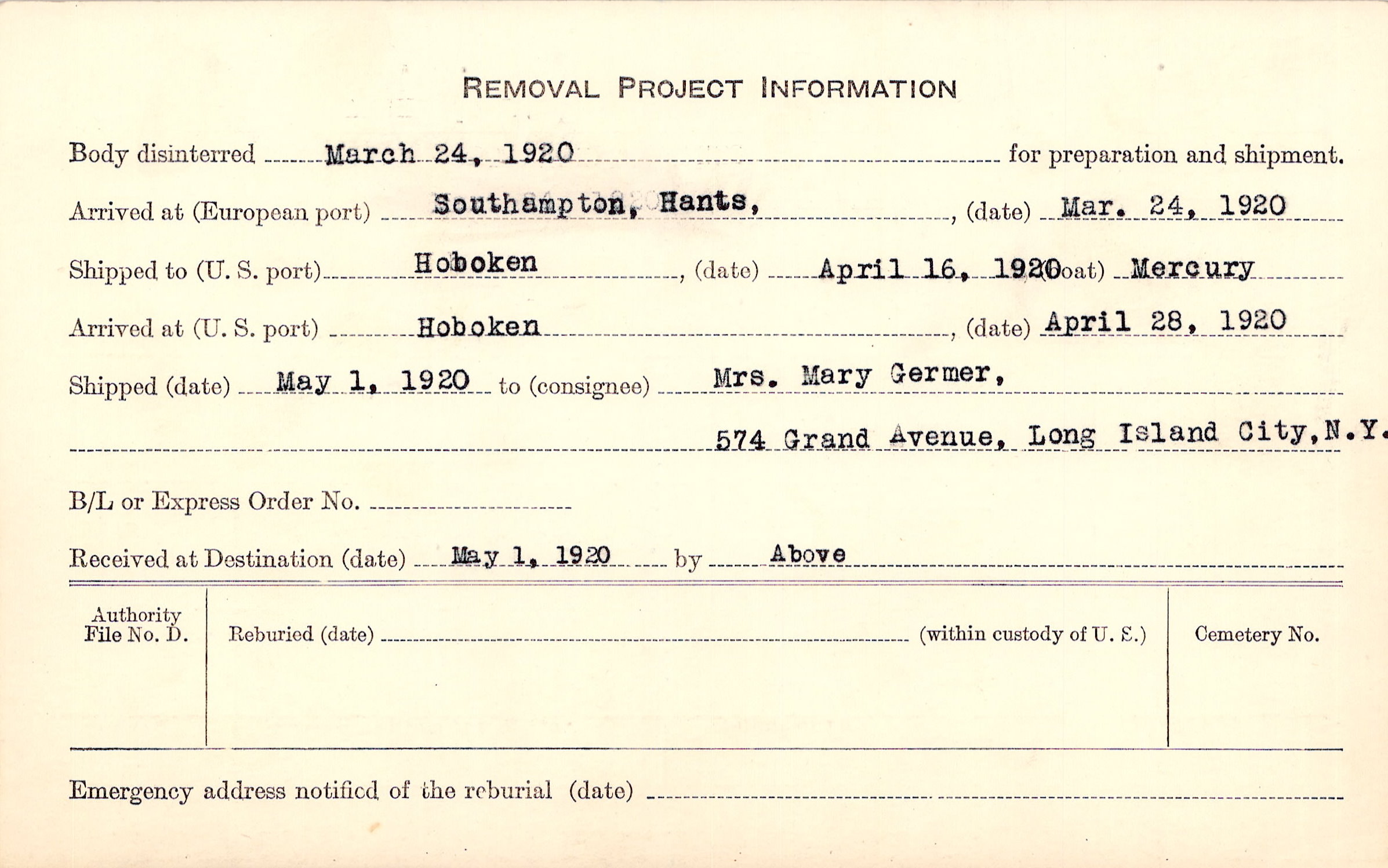 to Mrs. Mary Germer, 574 Grand Avenue, Long Island City, N.Y.