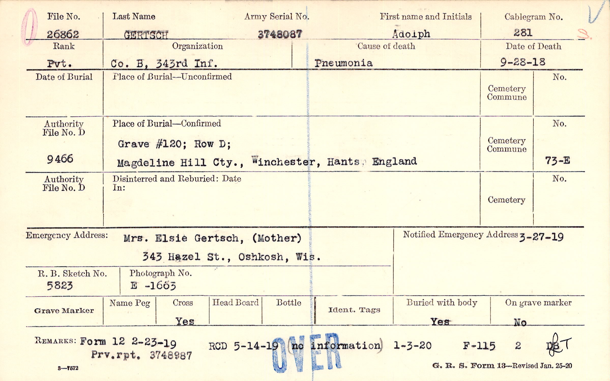 Mrs. Elsie Gertsch, (Mother), 343 Hazel St., Oshkosh, Wis.