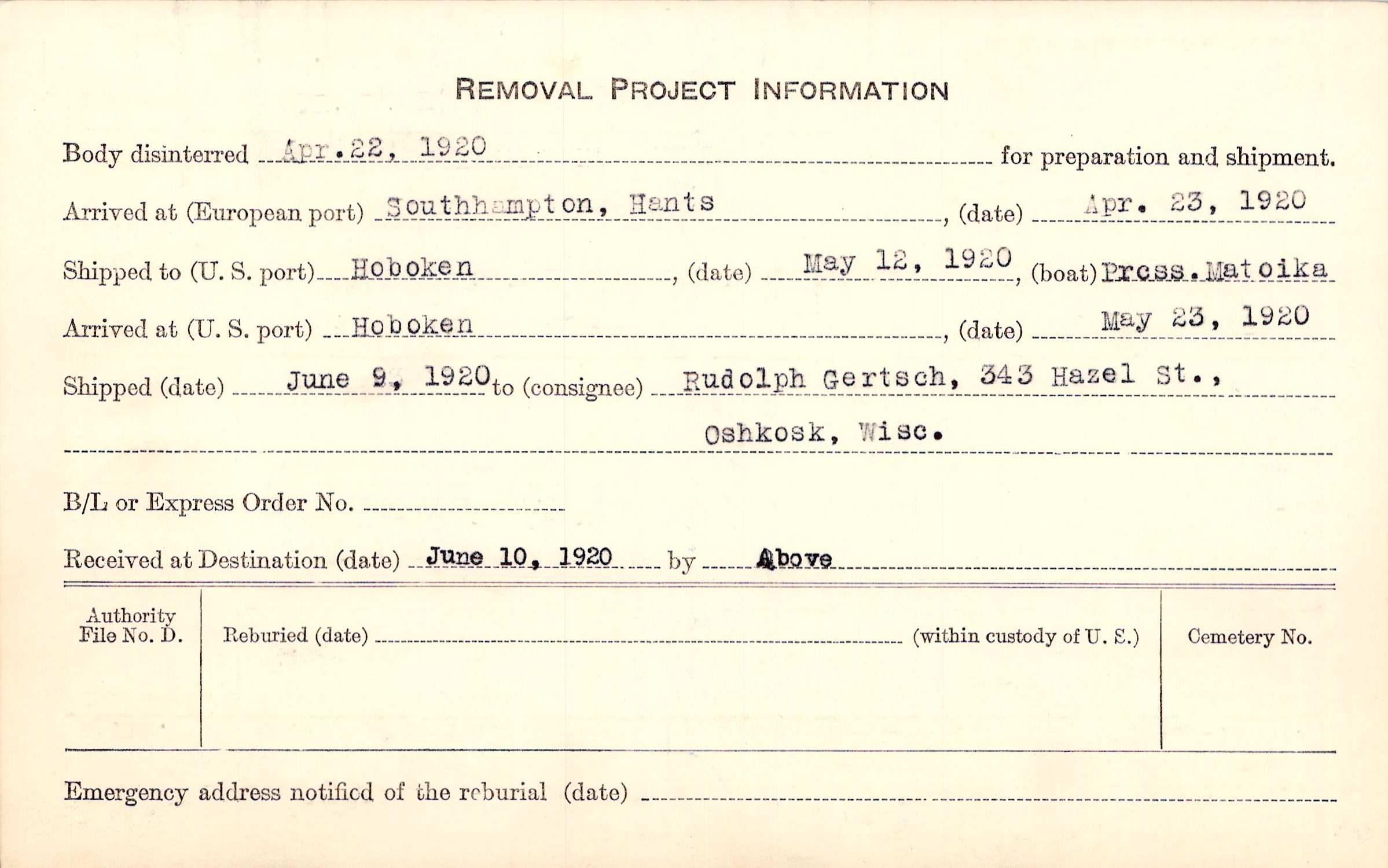 Body disinterred 4/22/1920 for preparation and shipment.