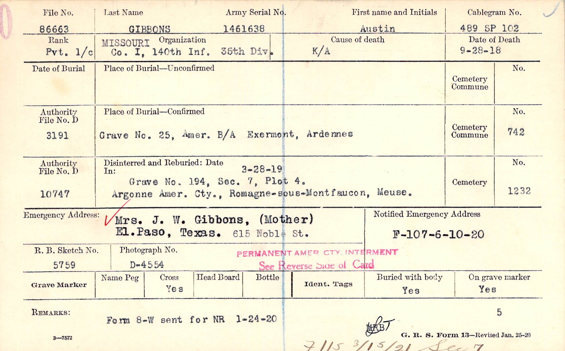 Mrs. J. W. Gibbons, (Mother), El. Paso, Texas. 615 Noble St.