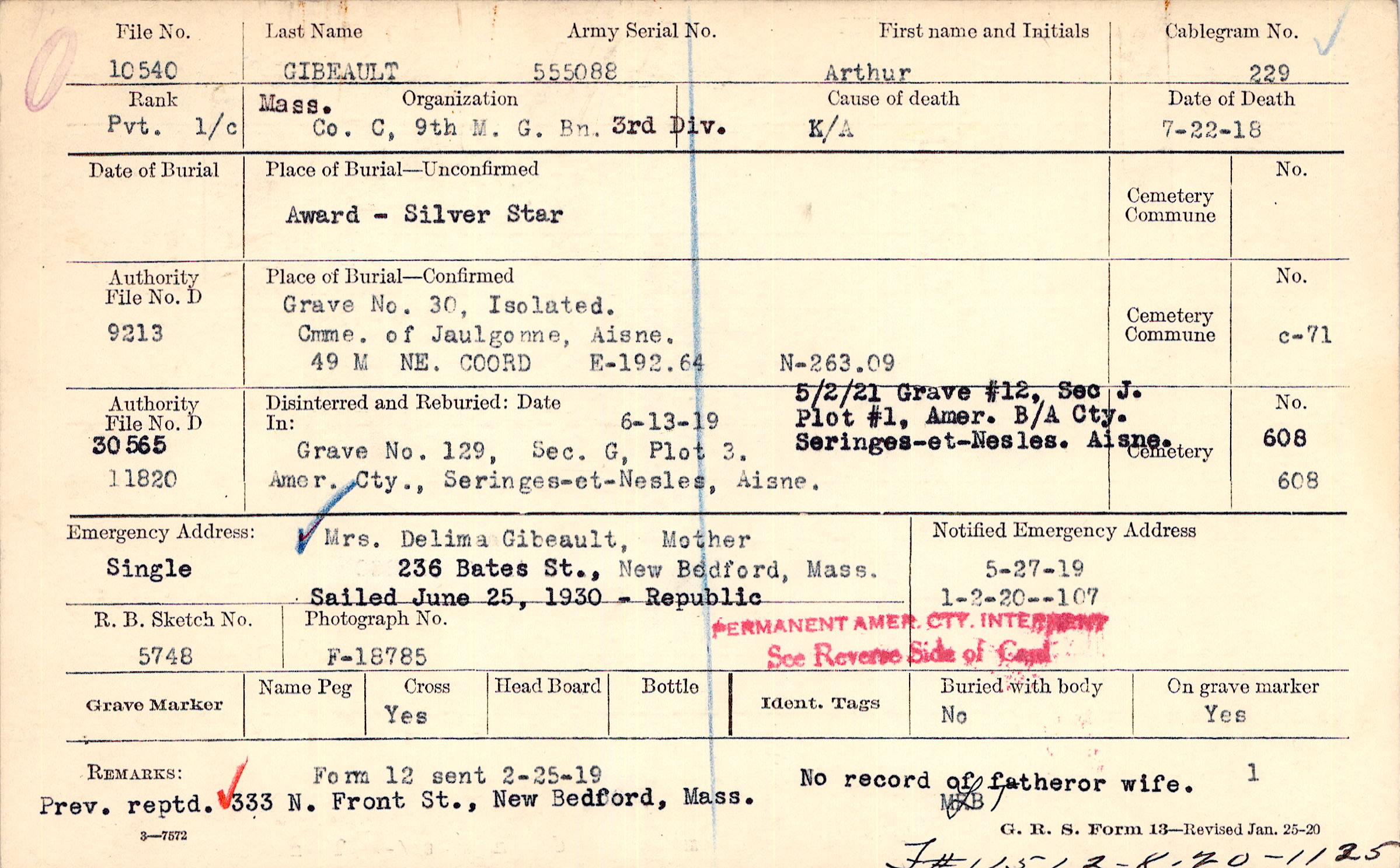Mrs. Delima Gibeault, Mother, 236 Bates St., New Bedford, Mass., Single Sailed June 25, 1930 - Republic