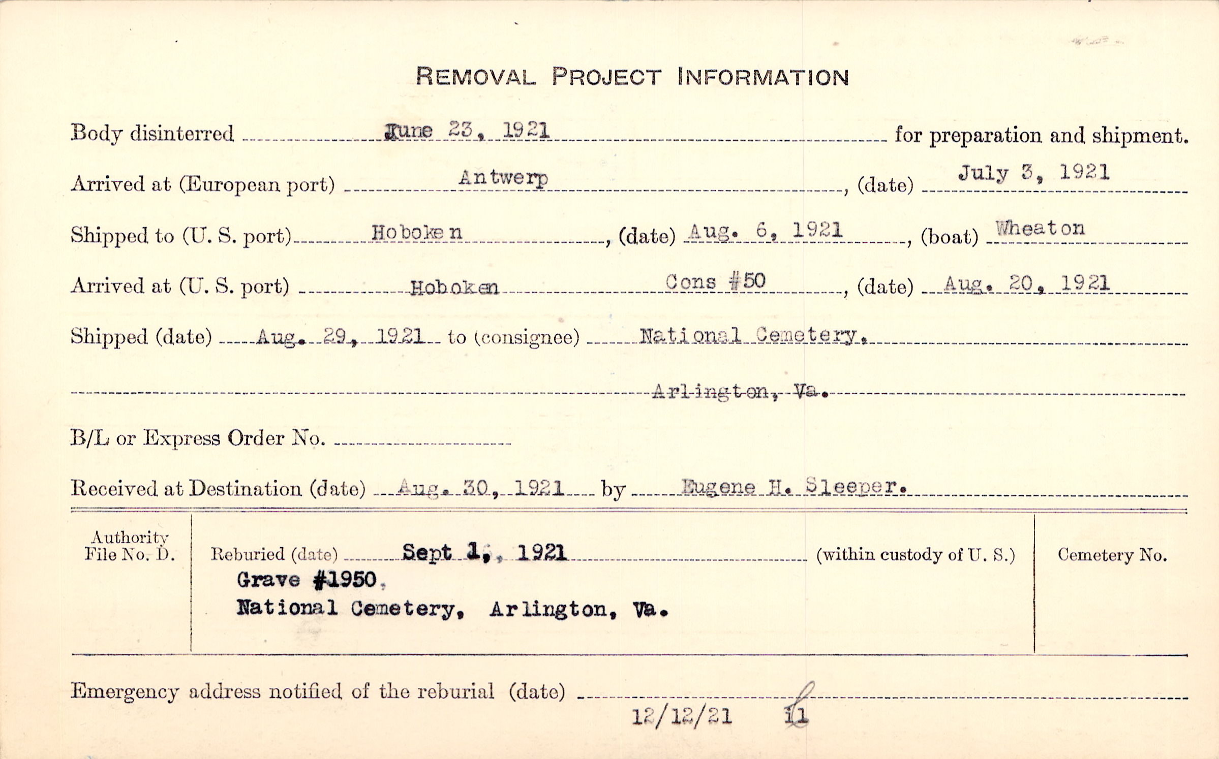 Body disinterred 6/23/1921 for preparation and shipment.