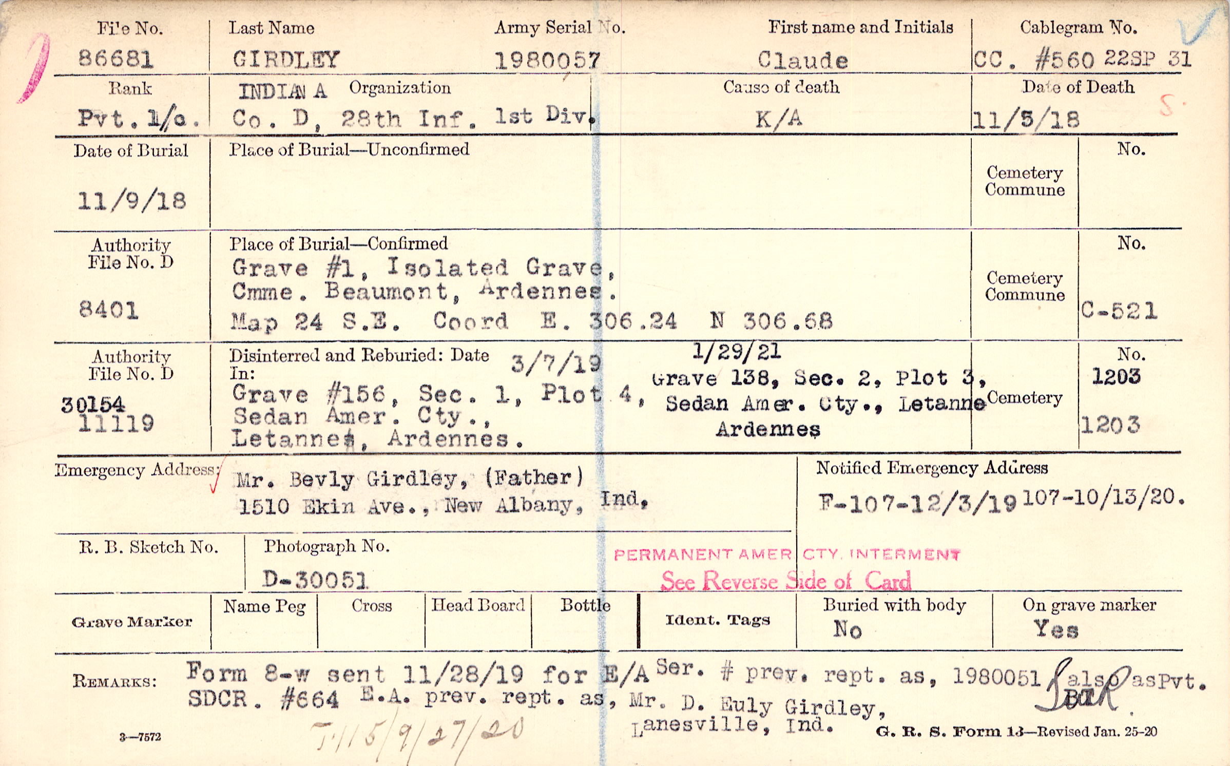 Mr. Bevly Girdley, (Father), 1510 Ekin Ave., New Albany, Ind,