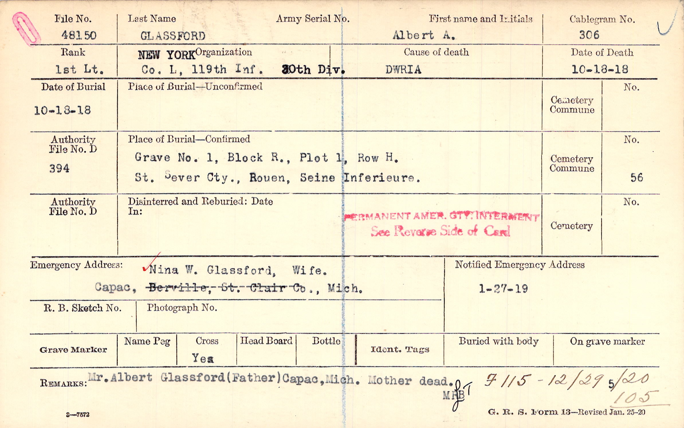 Nina W. Glassford, Wife, Capac, Mich., Capac, Mr. Albert Glassford (Father) Capac, Mich. Mother dead.