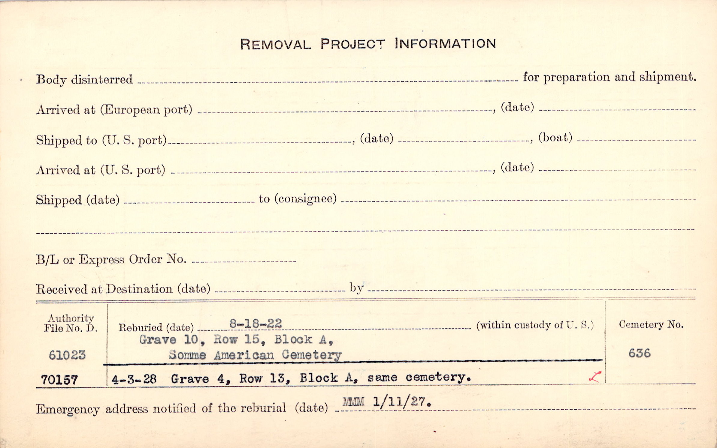 Grave 1, Block R., Plot 1, Row H., St. Sever Cty., Rouen, Seine Inferieure.
