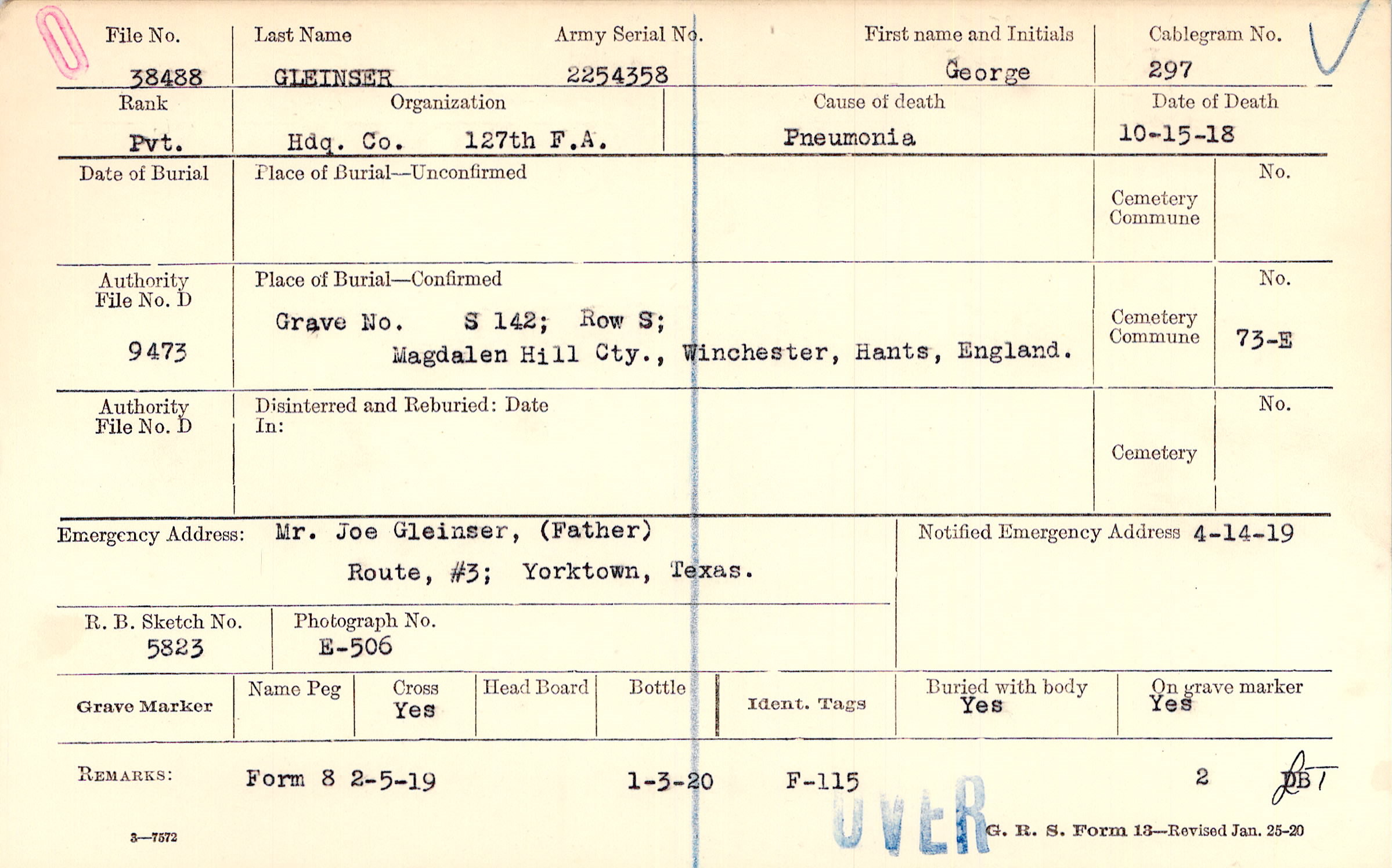 Mr. Joe Gleinser, (Father), Route, #3; Yorktown, Texas., 5823