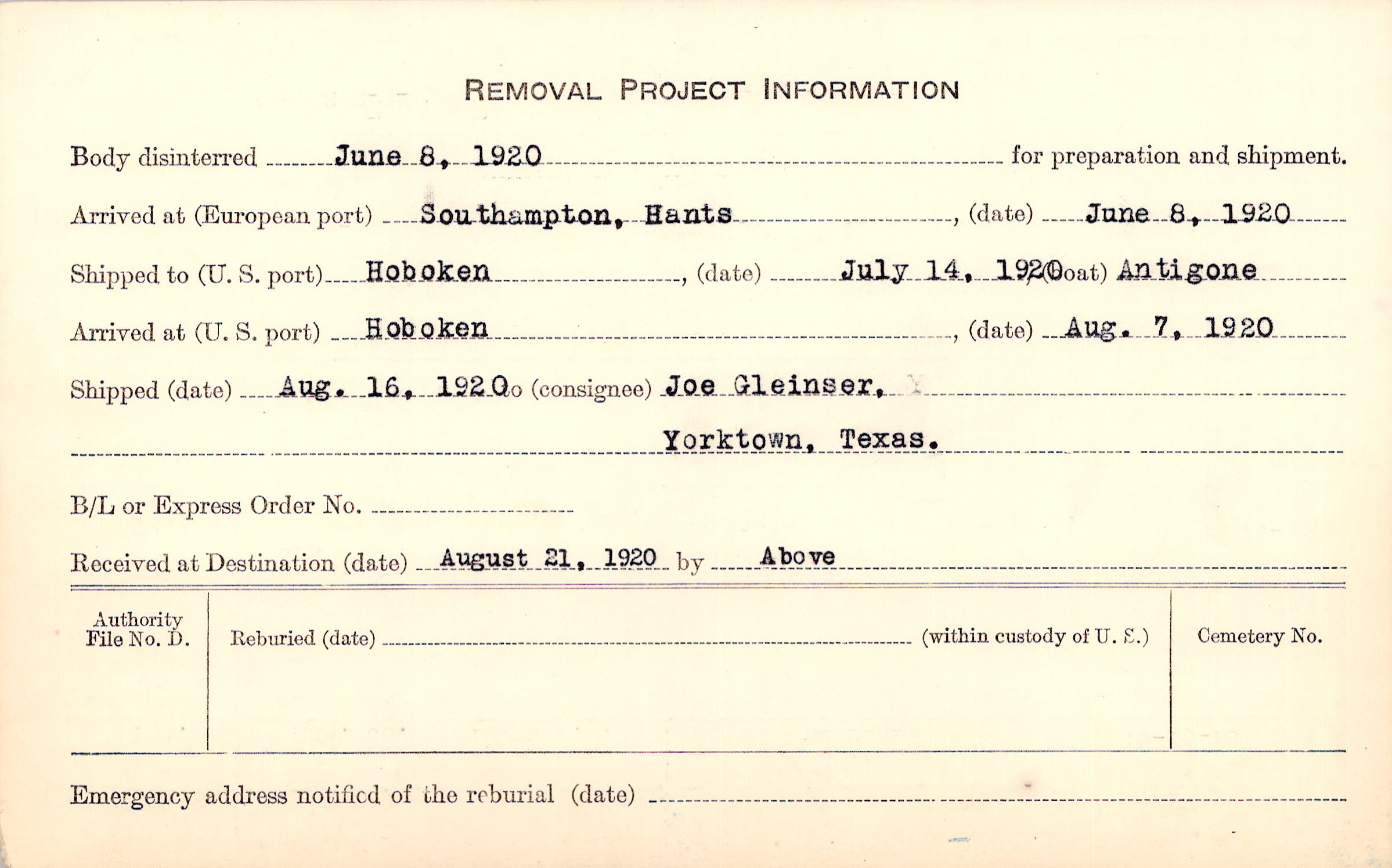 Body disinterred 6/8/1920 for preparation and shipment.
